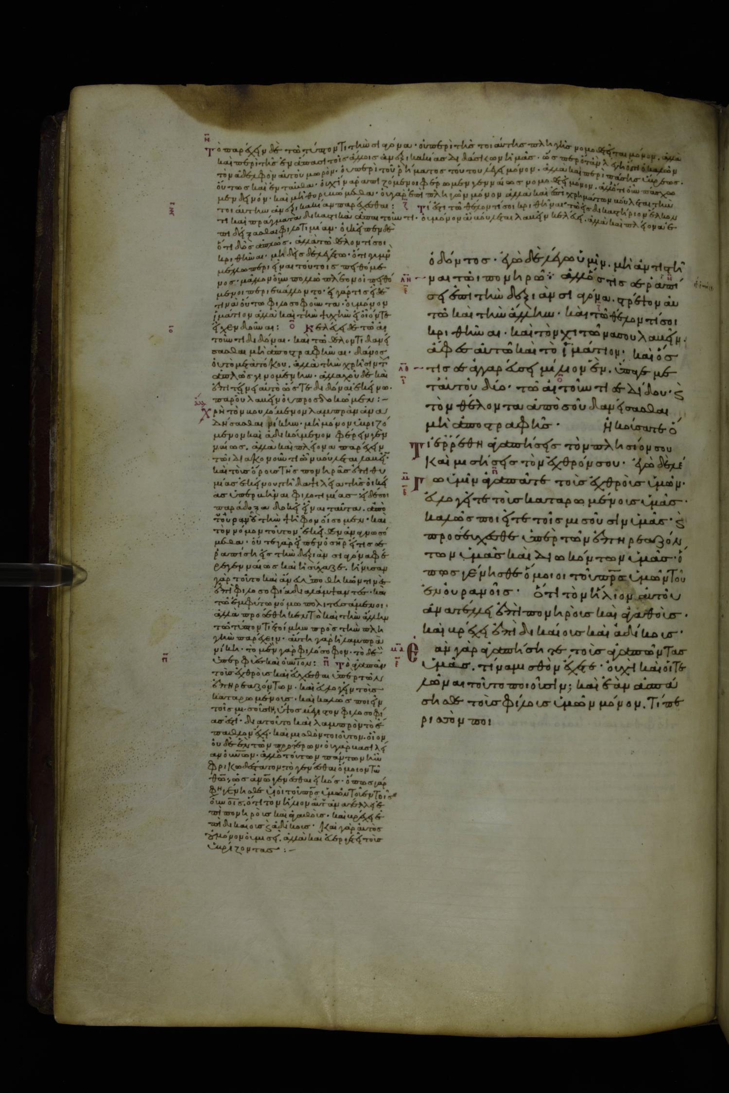 Tenth century minuscule of the Gospels with commentary; 285 leaves, 1 column, 4-34 lines per column. Images were taken at the National Library of Greece in Athens.