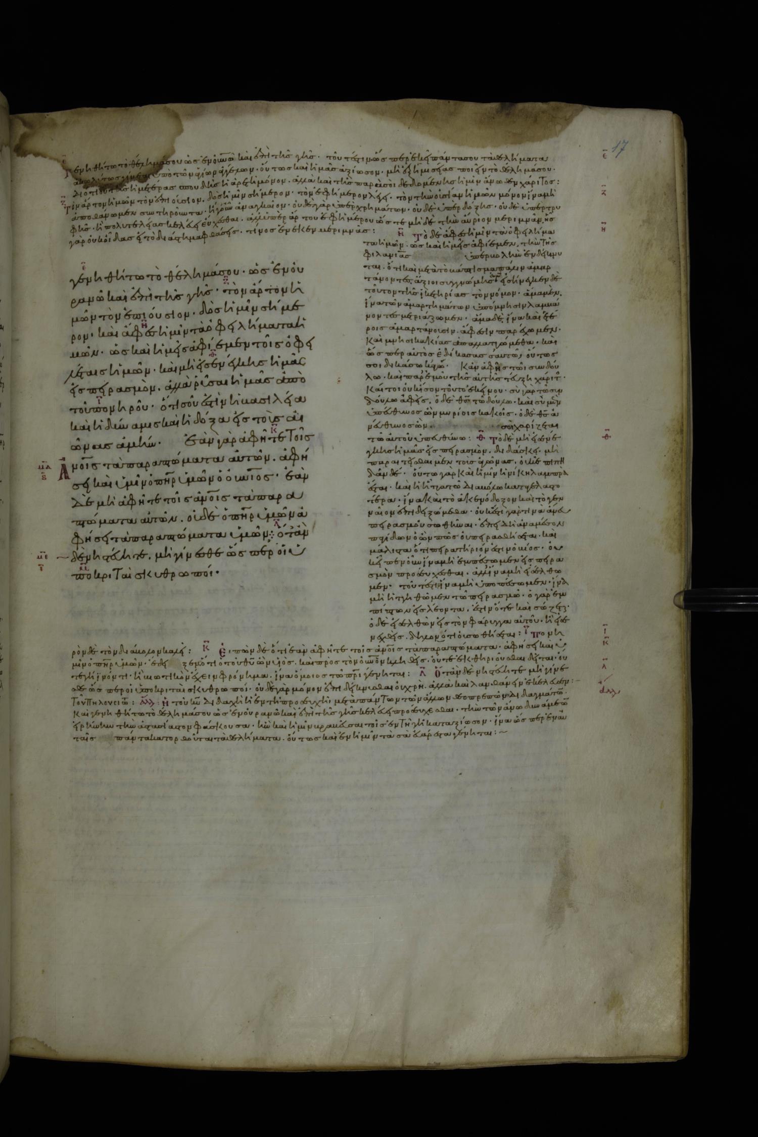 Tenth century minuscule of the Gospels with commentary; 285 leaves, 1 column, 4-34 lines per column. Images were taken at the National Library of Greece in Athens.
