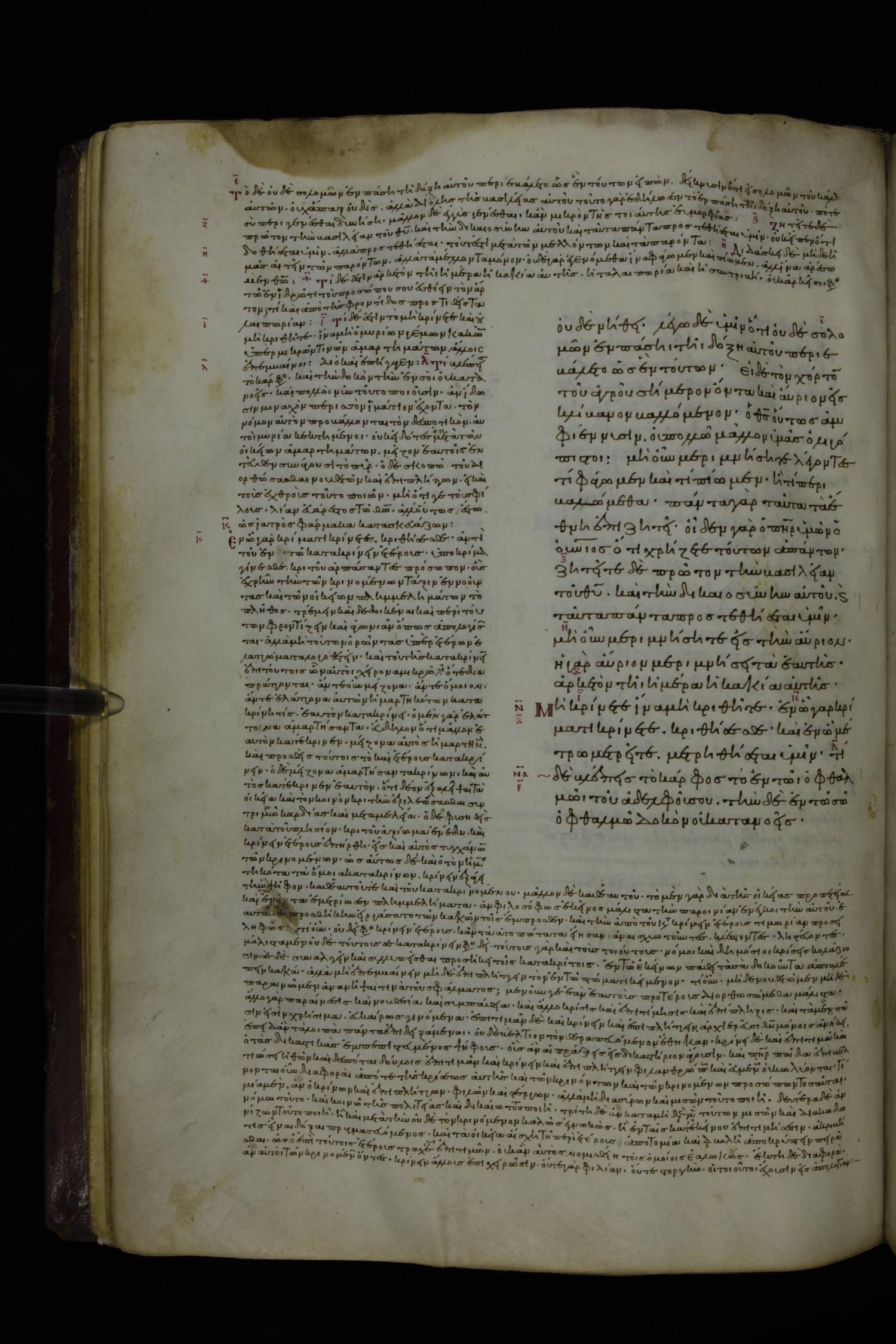 Tenth century minuscule of the Gospels with commentary; 285 leaves, 1 column, 4-34 lines per column. Images were taken at the National Library of Greece in Athens.