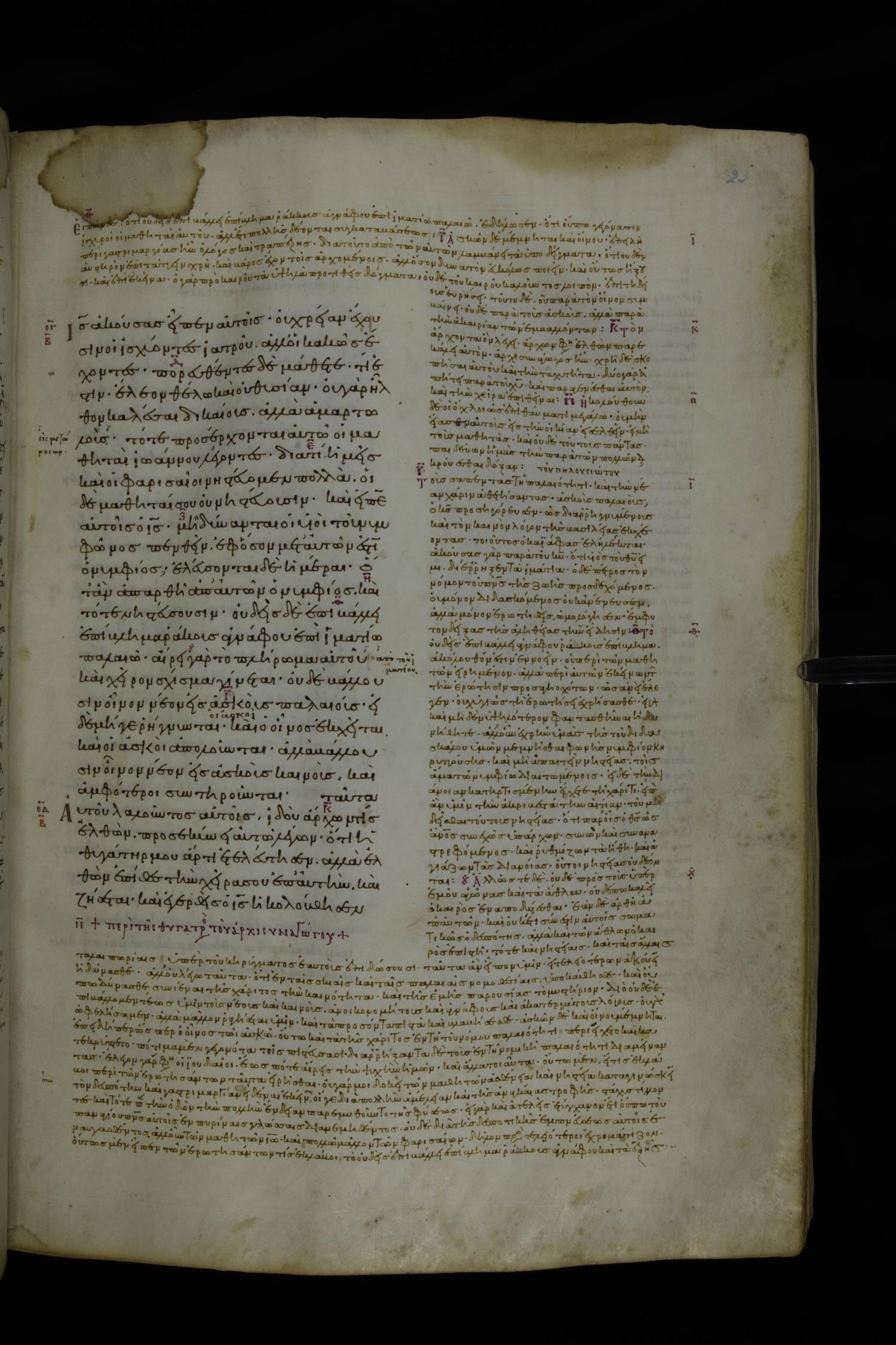 Tenth century minuscule of the Gospels with commentary; 285 leaves, 1 column, 4-34 lines per column. Images were taken at the National Library of Greece in Athens.