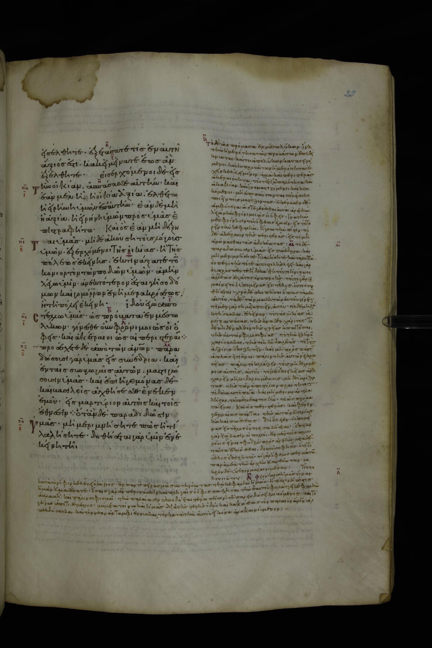 Tenth century minuscule of the Gospels with commentary; 285 leaves, 1 column, 4-34 lines per column. Images were taken at the National Library of Greece in Athens.