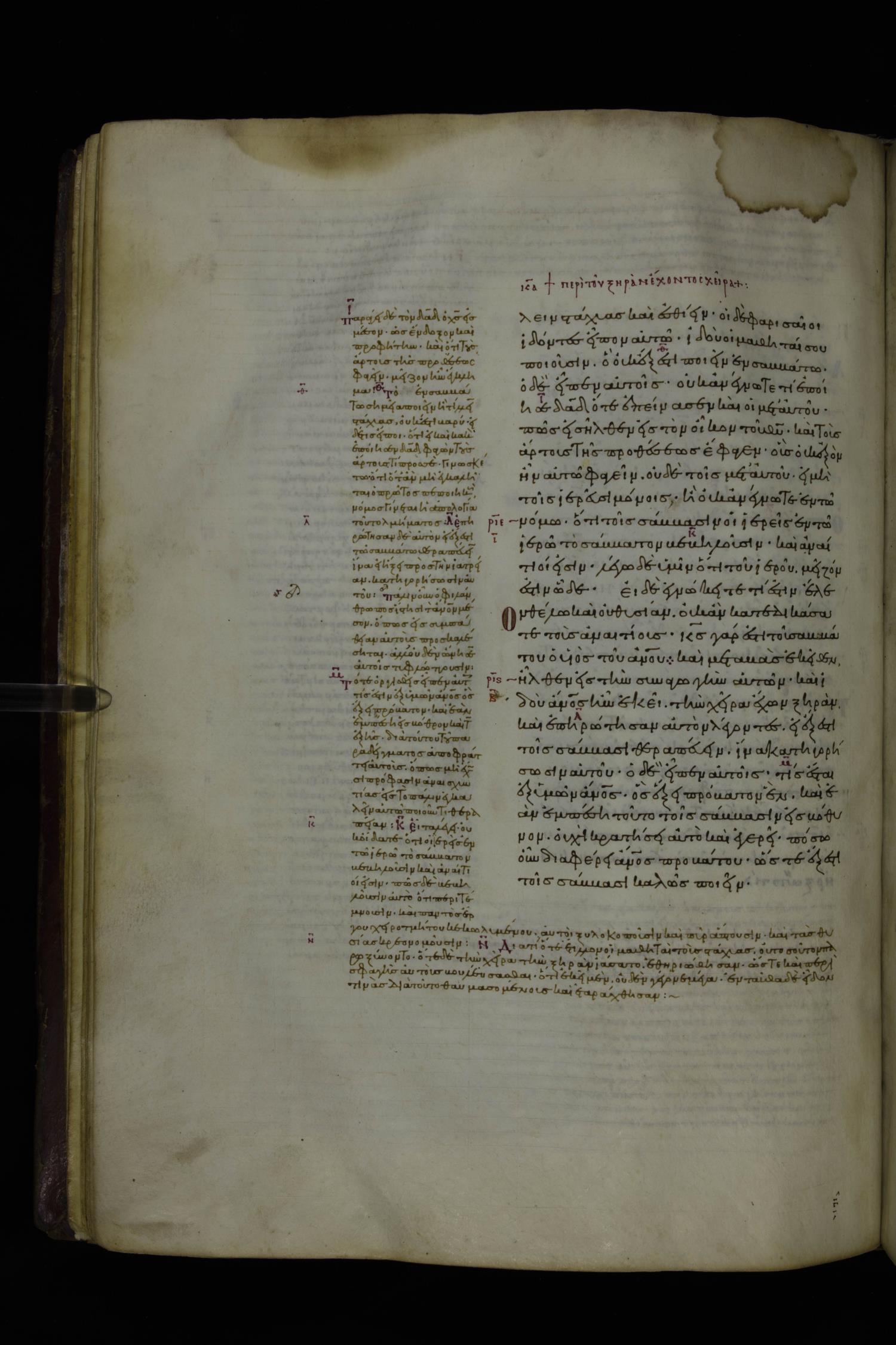 Tenth century minuscule of the Gospels with commentary; 285 leaves, 1 column, 4-34 lines per column. Images were taken at the National Library of Greece in Athens.