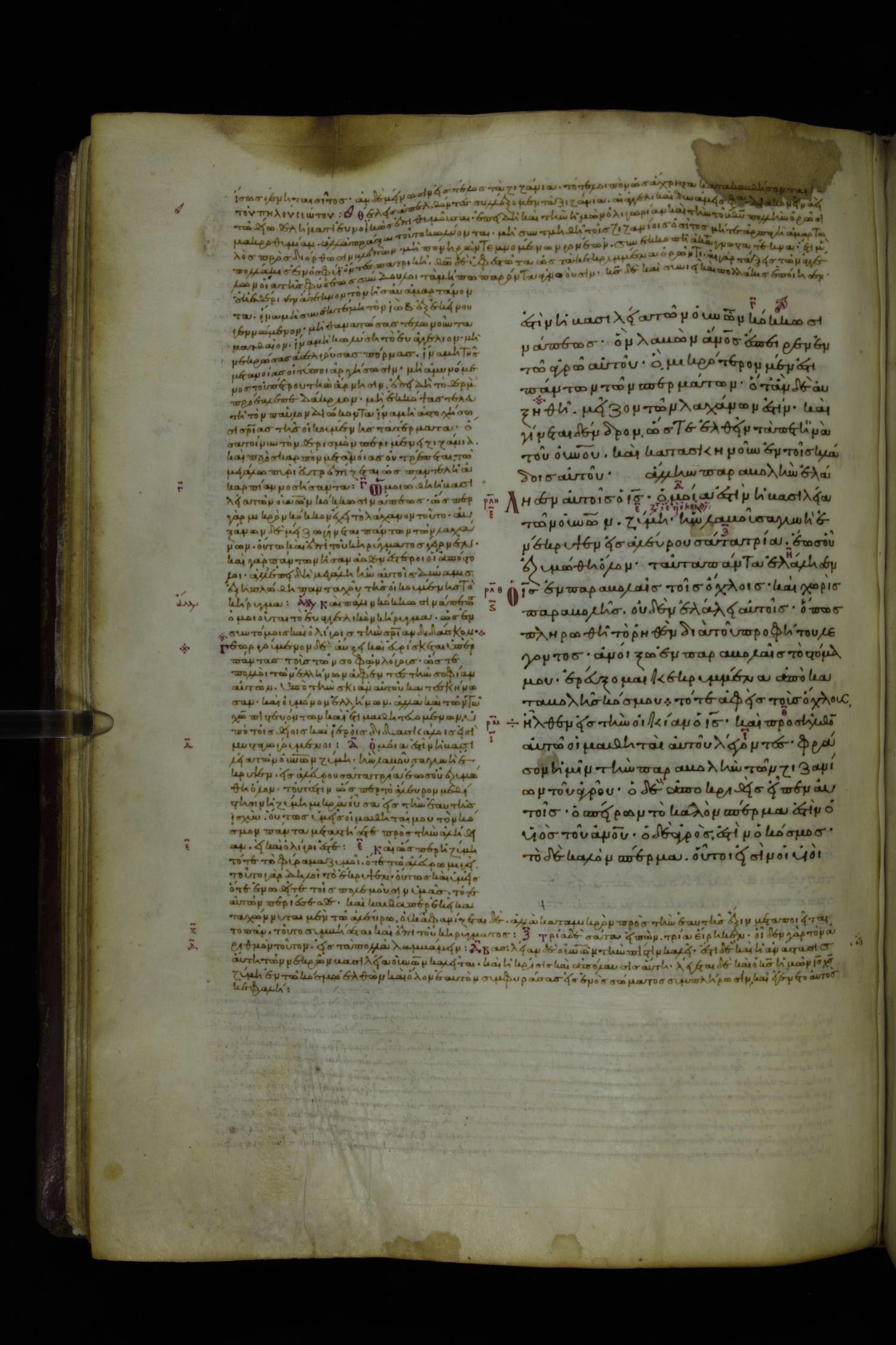 Tenth century minuscule of the Gospels with commentary; 285 leaves, 1 column, 4-34 lines per column. Images were taken at the National Library of Greece in Athens.