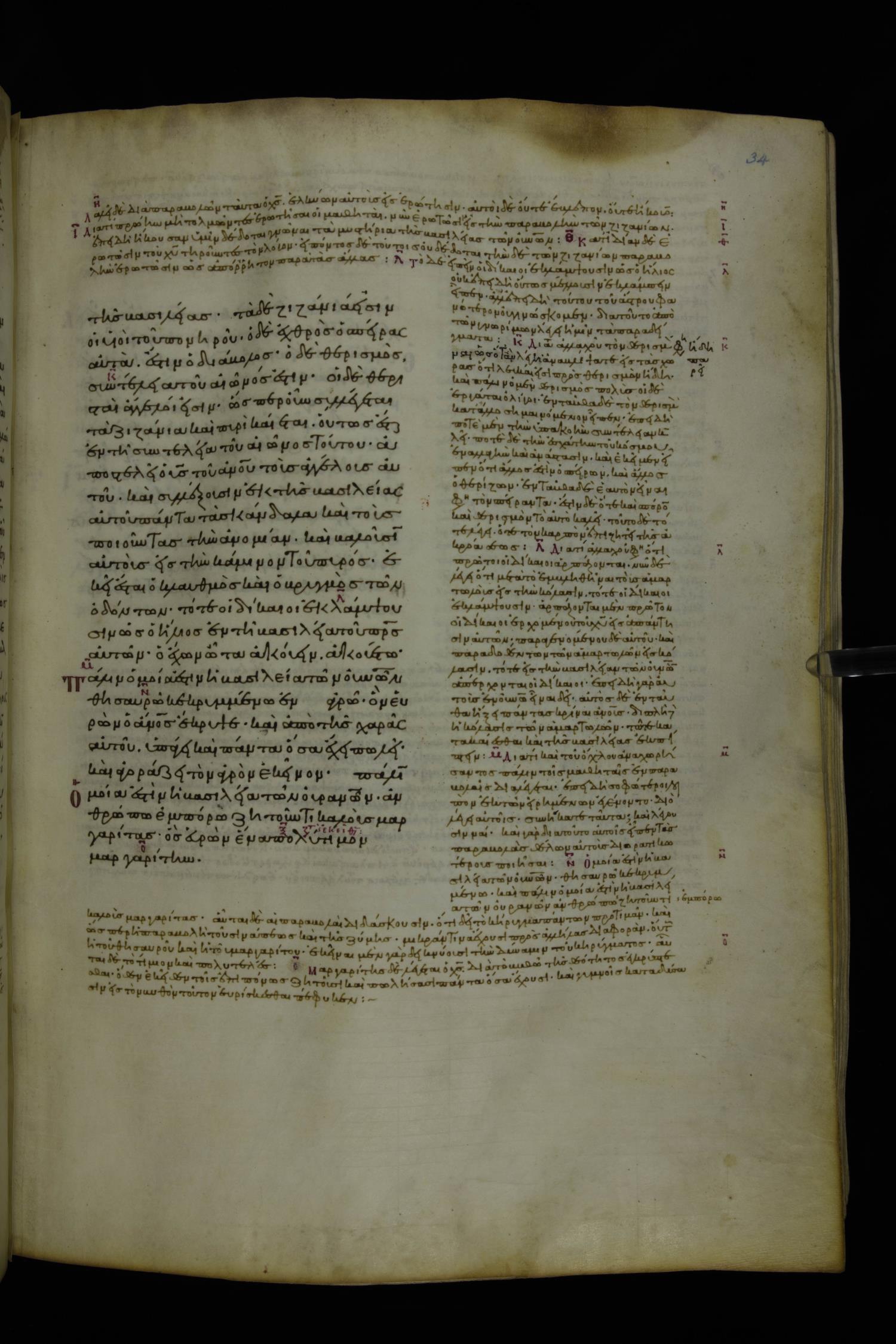 Tenth century minuscule of the Gospels with commentary; 285 leaves, 1 column, 4-34 lines per column. Images were taken at the National Library of Greece in Athens.