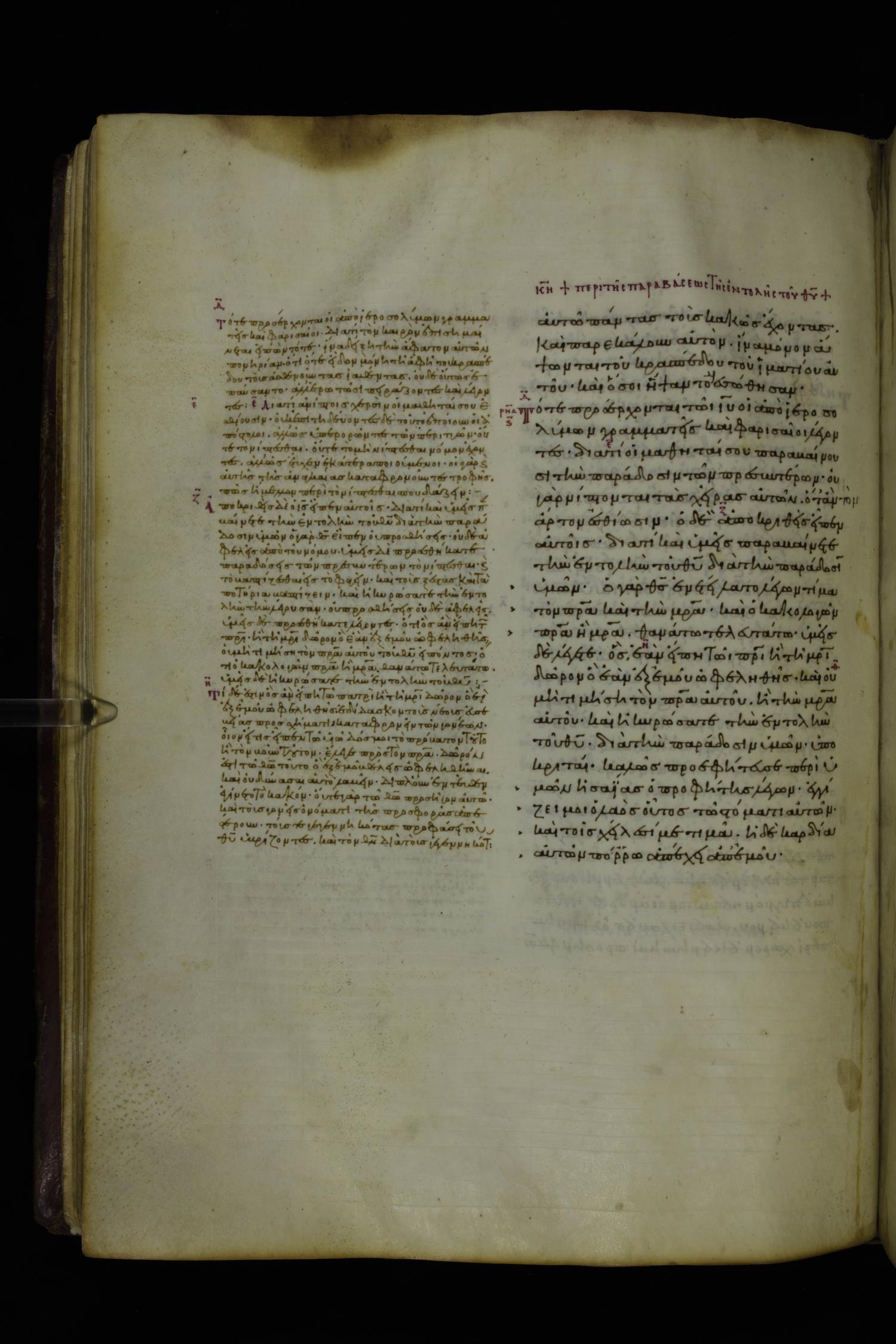 Tenth century minuscule of the Gospels with commentary; 285 leaves, 1 column, 4-34 lines per column. Images were taken at the National Library of Greece in Athens.