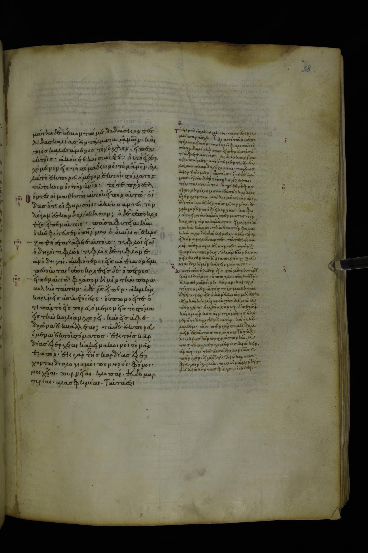Tenth century minuscule of the Gospels with commentary; 285 leaves, 1 column, 4-34 lines per column. Images were taken at the National Library of Greece in Athens.