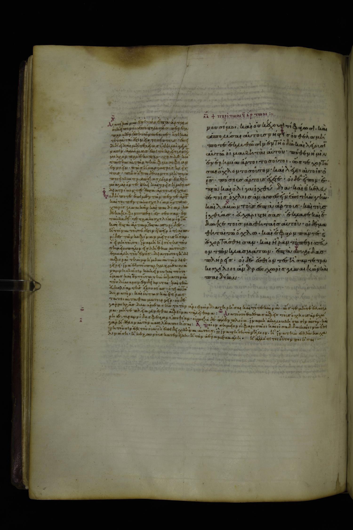 Tenth century minuscule of the Gospels with commentary; 285 leaves, 1 column, 4-34 lines per column. Images were taken at the National Library of Greece in Athens.