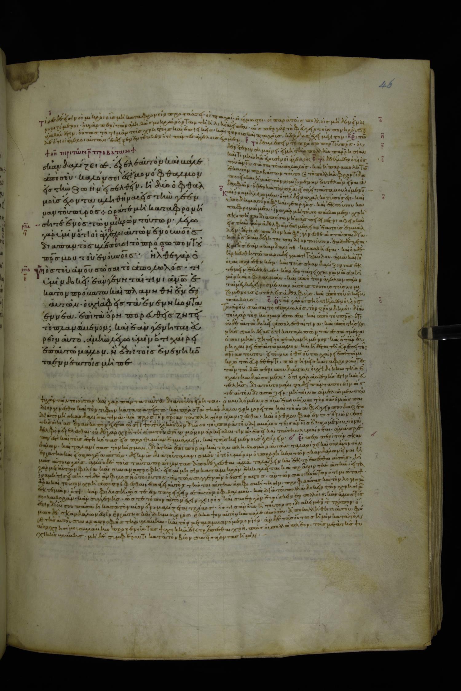 Tenth century minuscule of the Gospels with commentary; 285 leaves, 1 column, 4-34 lines per column. Images were taken at the National Library of Greece in Athens.