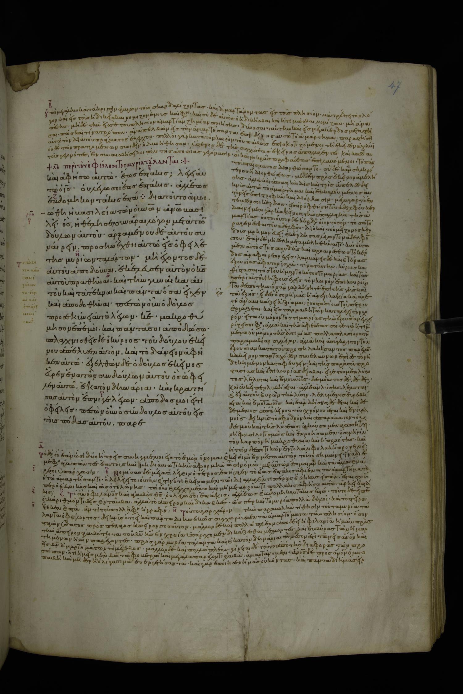 Tenth century minuscule of the Gospels with commentary; 285 leaves, 1 column, 4-34 lines per column. Images were taken at the National Library of Greece in Athens.