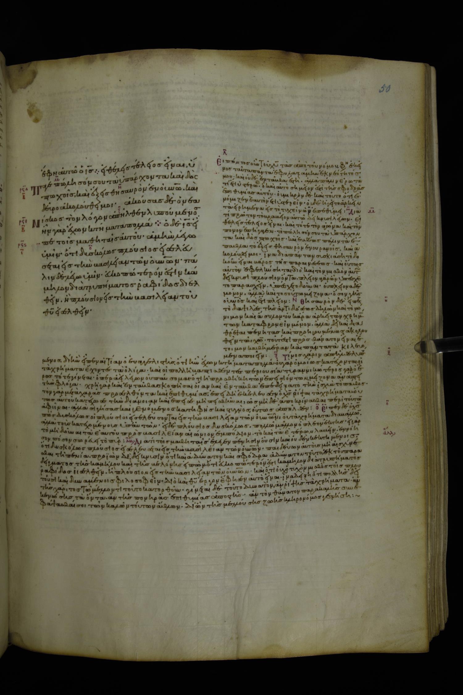 Tenth century minuscule of the Gospels with commentary; 285 leaves, 1 column, 4-34 lines per column. Images were taken at the National Library of Greece in Athens.