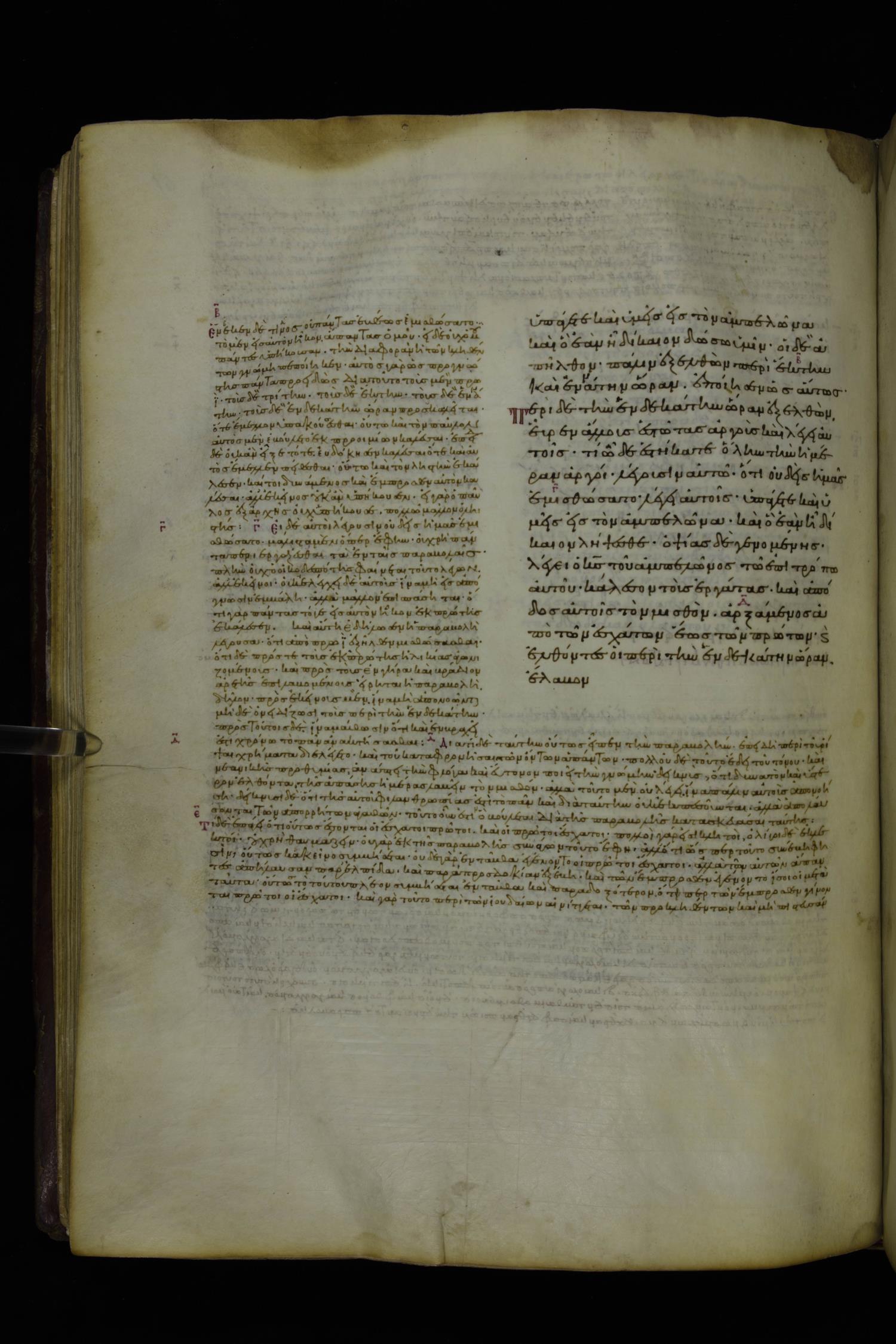 Tenth century minuscule of the Gospels with commentary; 285 leaves, 1 column, 4-34 lines per column. Images were taken at the National Library of Greece in Athens.
