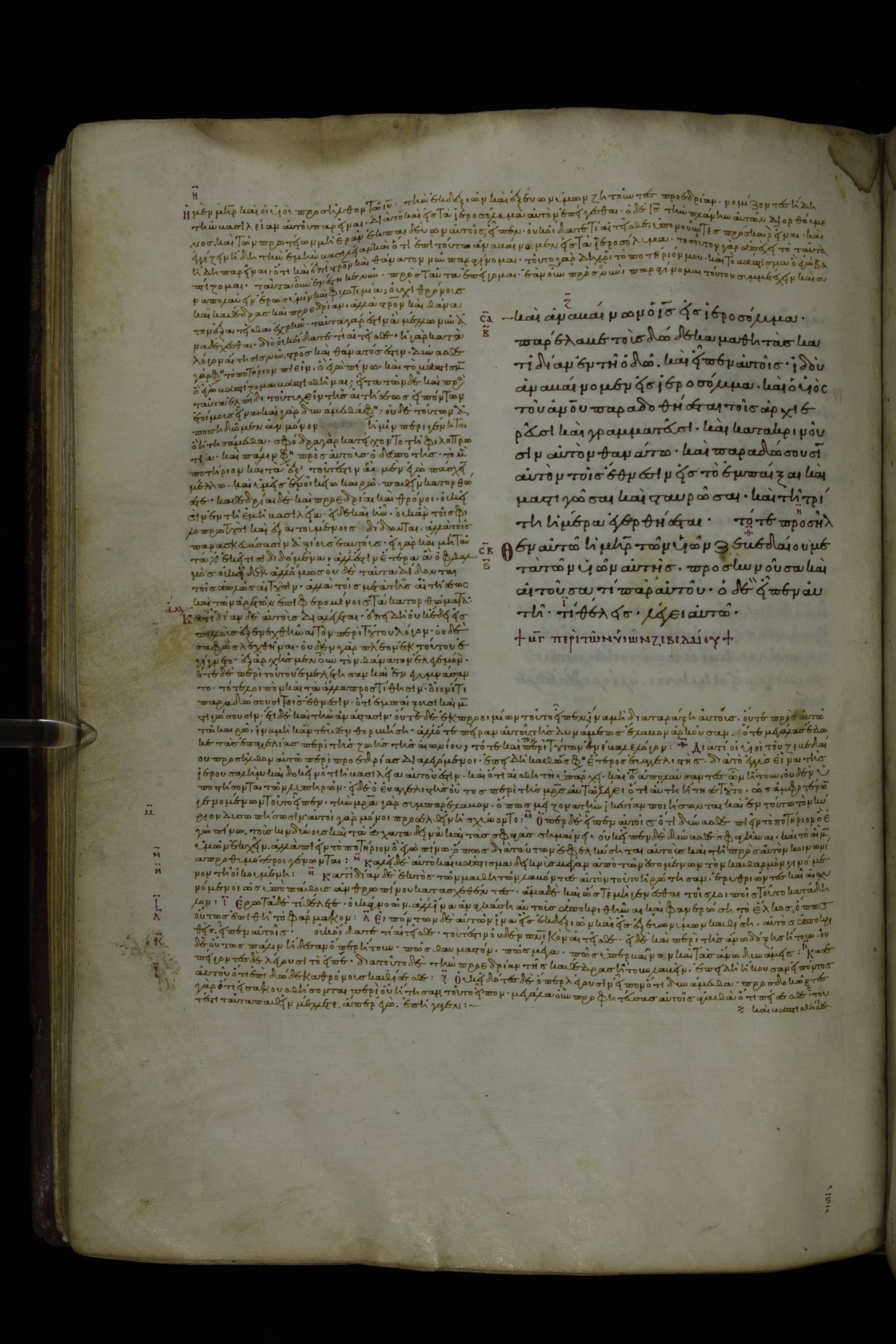 Tenth century minuscule of the Gospels with commentary; 285 leaves, 1 column, 4-34 lines per column. Images were taken at the National Library of Greece in Athens.