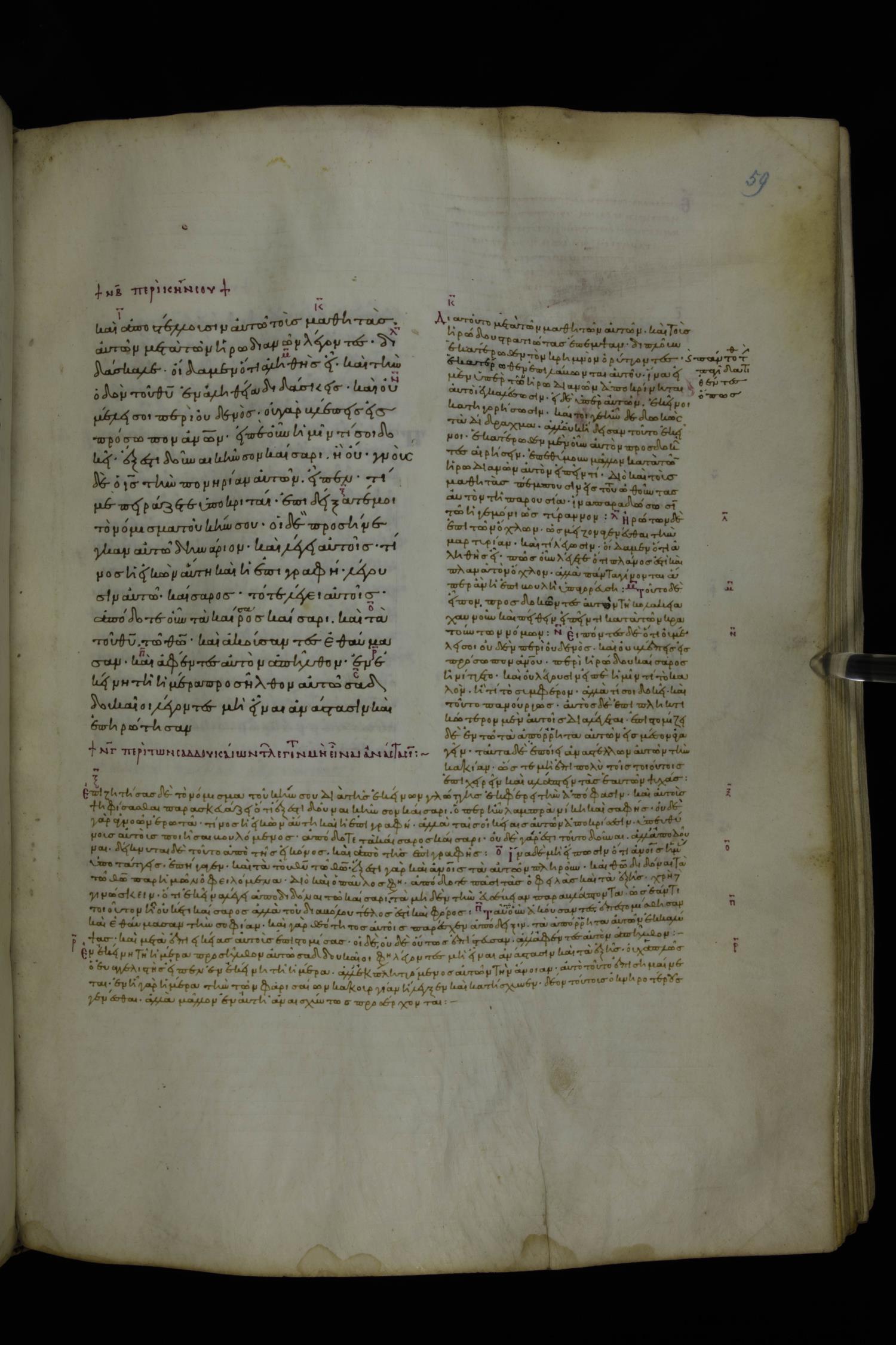 Tenth century minuscule of the Gospels with commentary; 285 leaves, 1 column, 4-34 lines per column. Images were taken at the National Library of Greece in Athens.