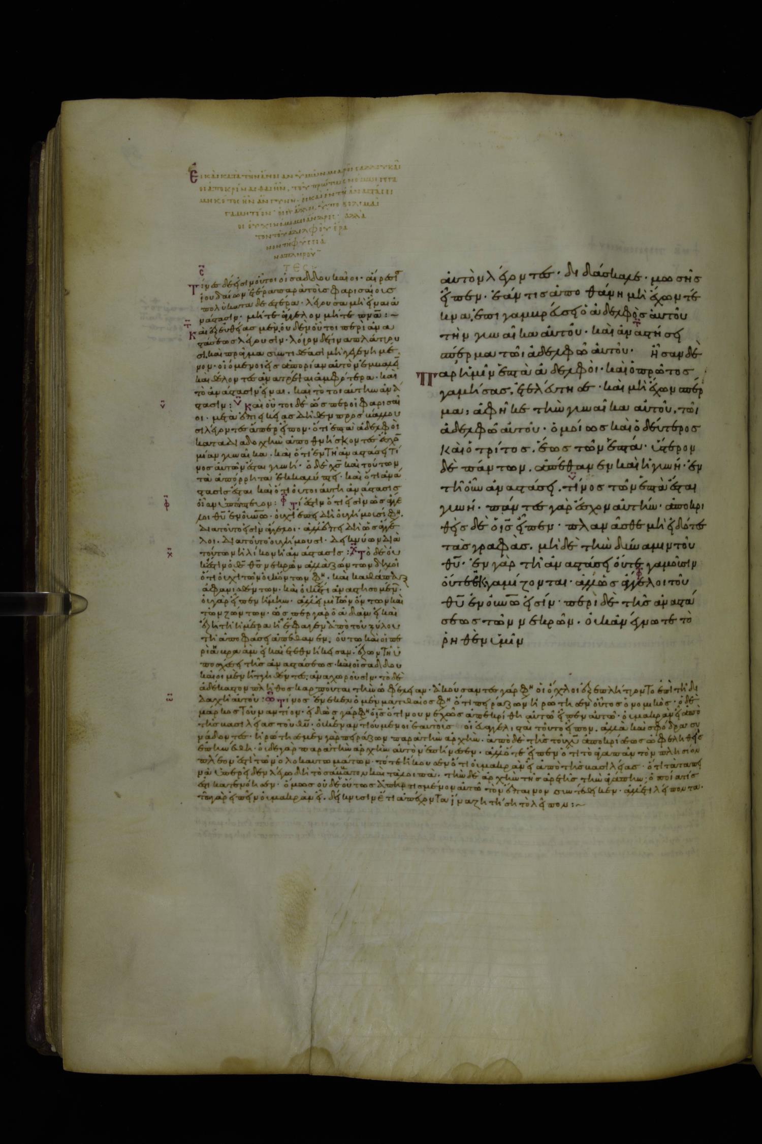 Tenth century minuscule of the Gospels with commentary; 285 leaves, 1 column, 4-34 lines per column. Images were taken at the National Library of Greece in Athens.
