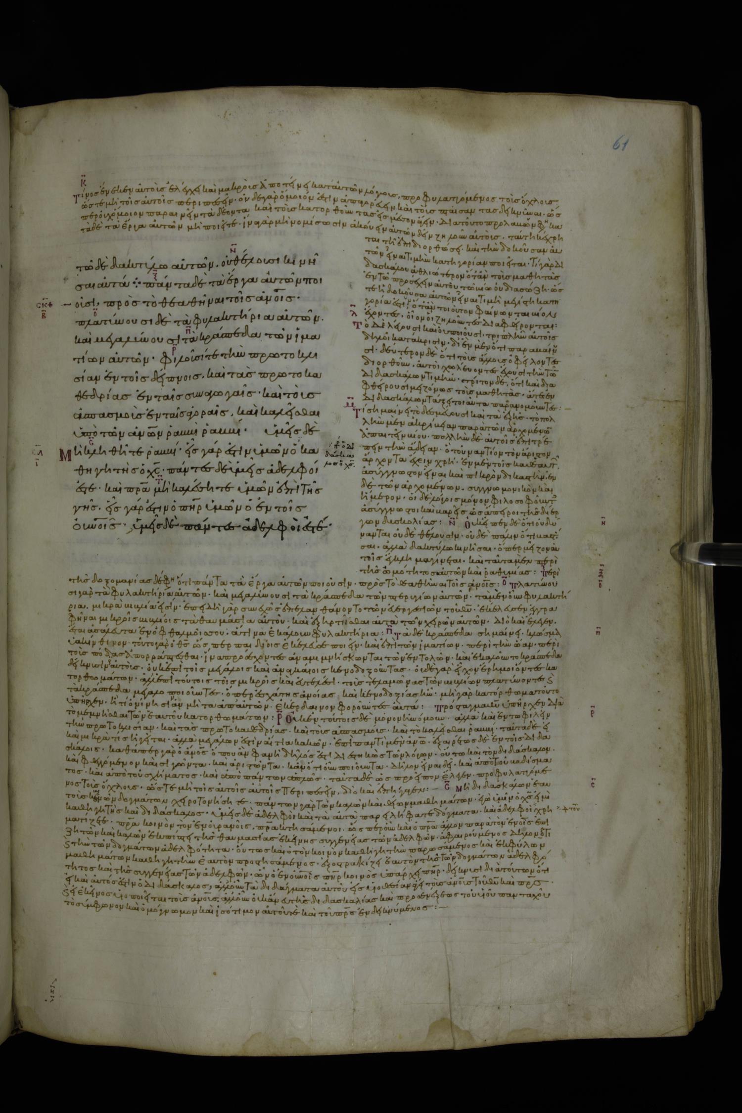 Tenth century minuscule of the Gospels with commentary; 285 leaves, 1 column, 4-34 lines per column. Images were taken at the National Library of Greece in Athens.