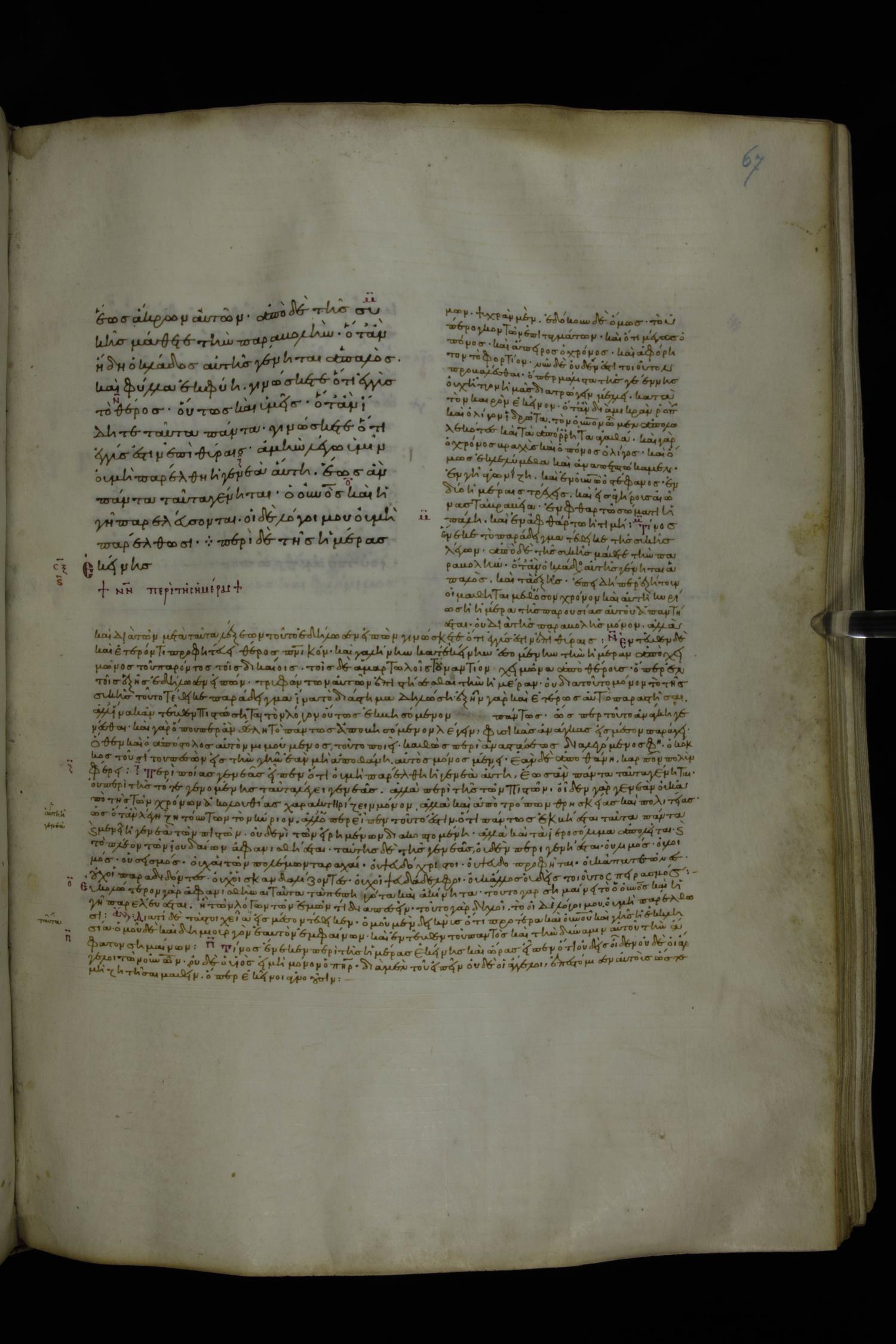 Tenth century minuscule of the Gospels with commentary; 285 leaves, 1 column, 4-34 lines per column. Images were taken at the National Library of Greece in Athens.