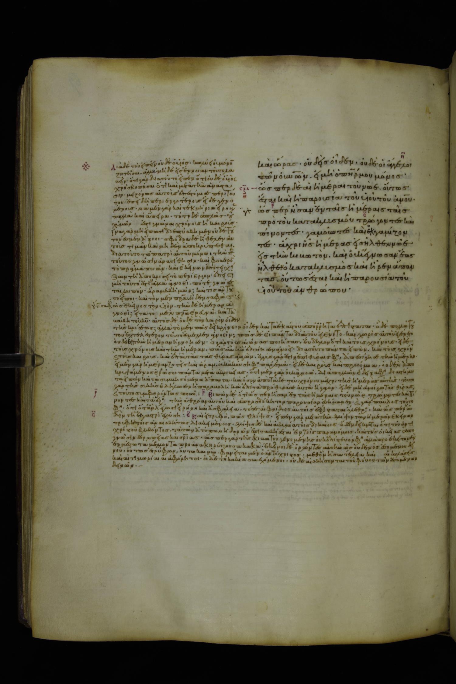 Tenth century minuscule of the Gospels with commentary; 285 leaves, 1 column, 4-34 lines per column. Images were taken at the National Library of Greece in Athens.