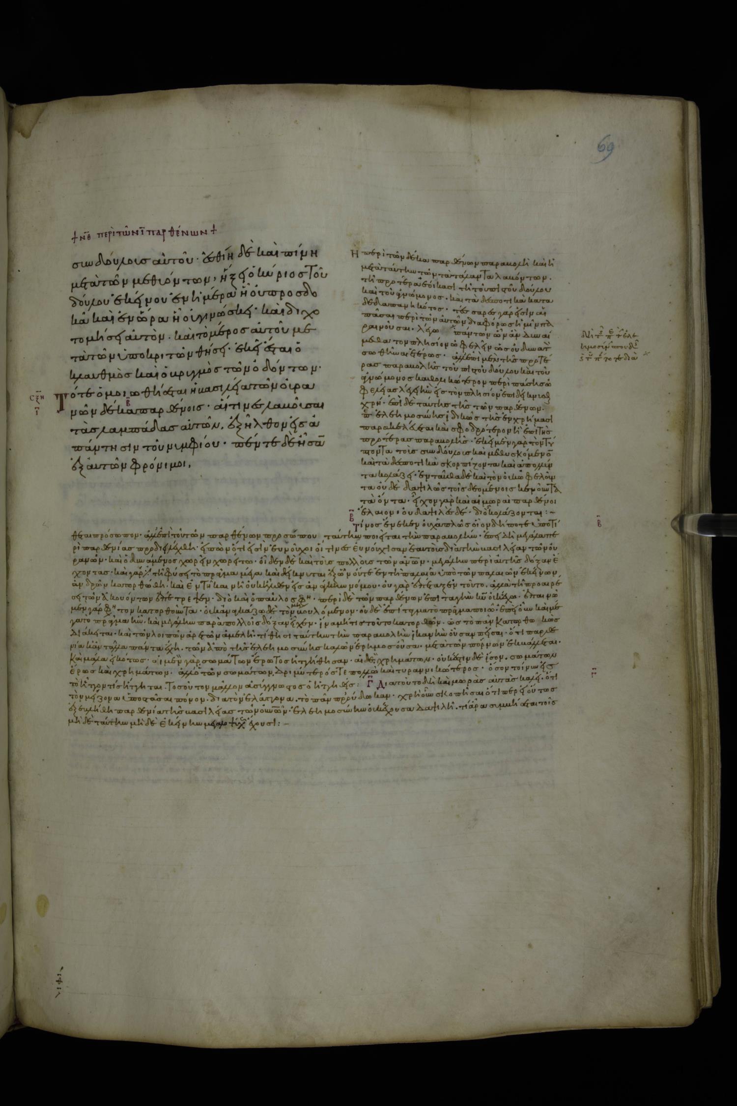 Tenth century minuscule of the Gospels with commentary; 285 leaves, 1 column, 4-34 lines per column. Images were taken at the National Library of Greece in Athens.