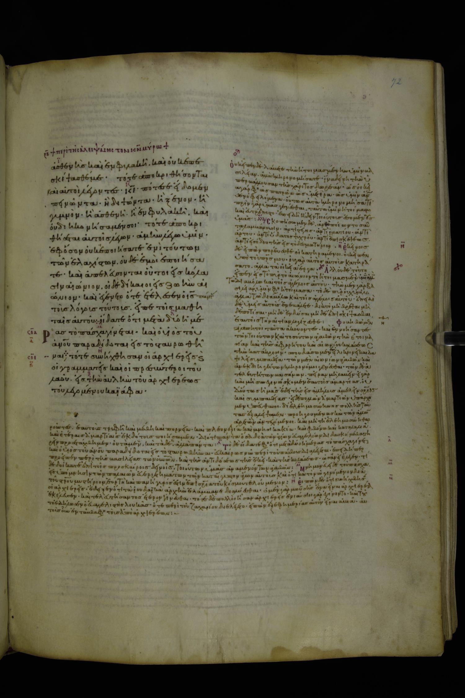 Tenth century minuscule of the Gospels with commentary; 285 leaves, 1 column, 4-34 lines per column. Images were taken at the National Library of Greece in Athens.