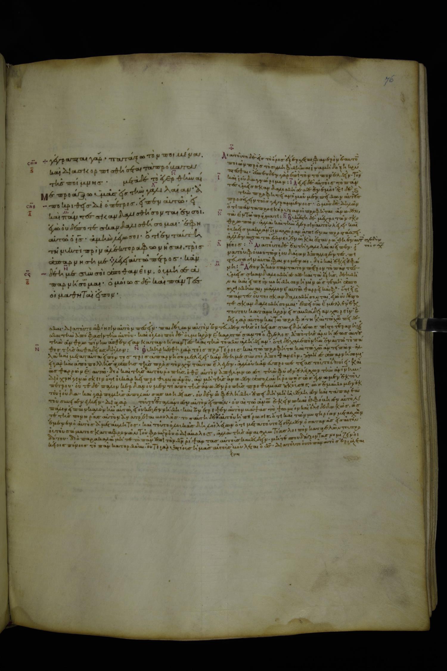 Tenth century minuscule of the Gospels with commentary; 285 leaves, 1 column, 4-34 lines per column. Images were taken at the National Library of Greece in Athens.