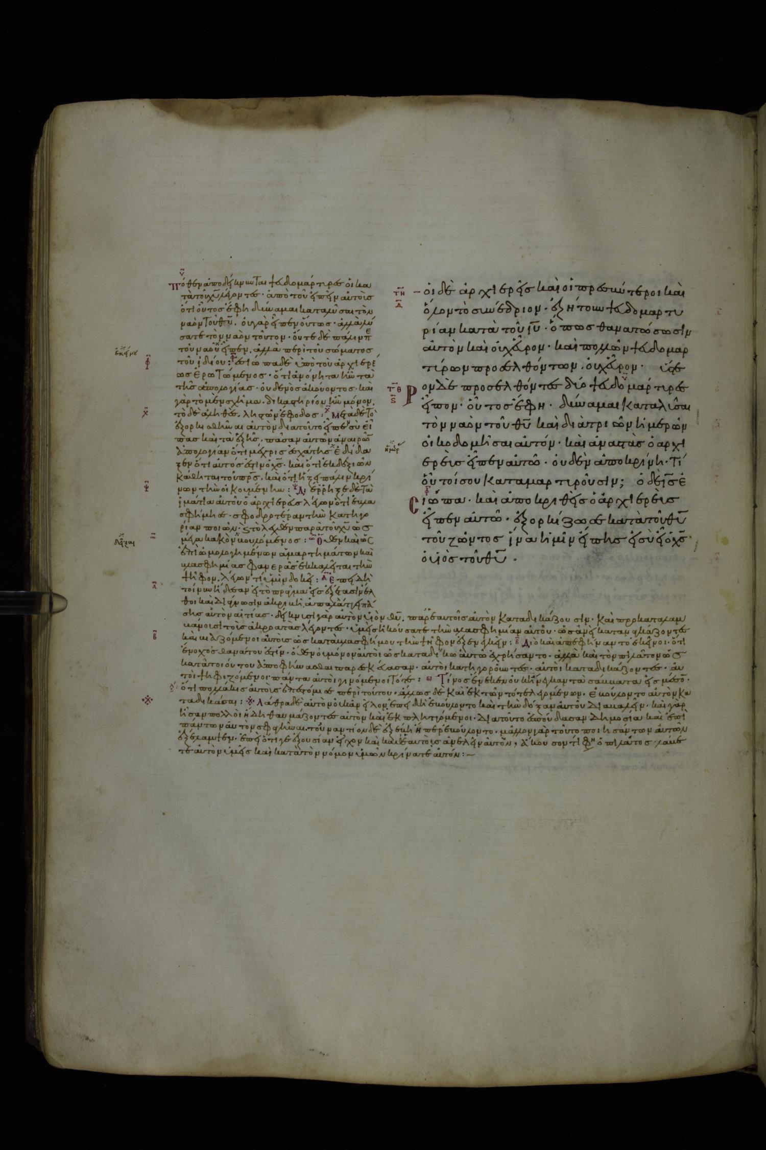 Tenth century minuscule of the Gospels with commentary; 285 leaves, 1 column, 4-34 lines per column. Images were taken at the National Library of Greece in Athens.