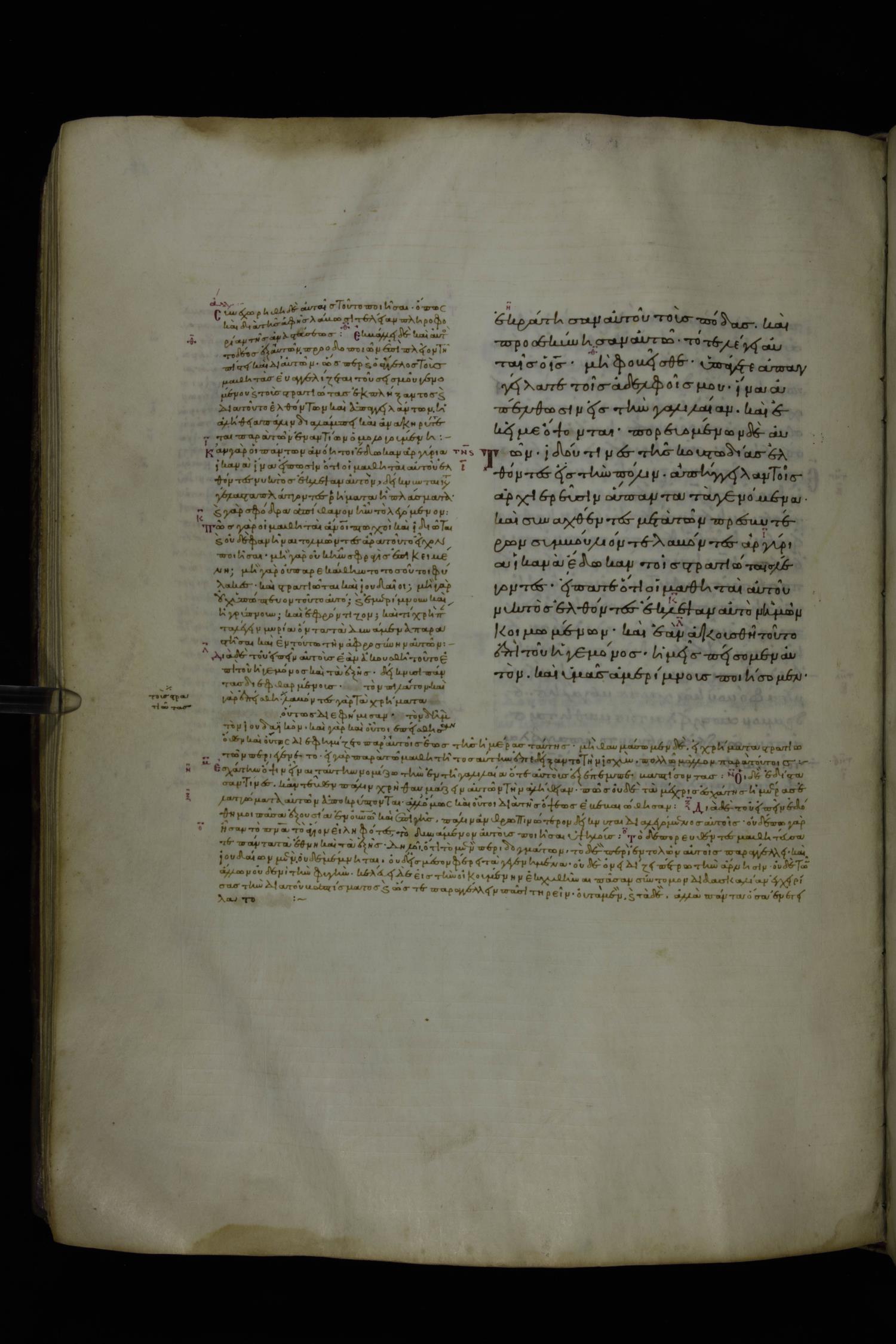 Tenth century minuscule of the Gospels with commentary; 285 leaves, 1 column, 4-34 lines per column. Images were taken at the National Library of Greece in Athens.