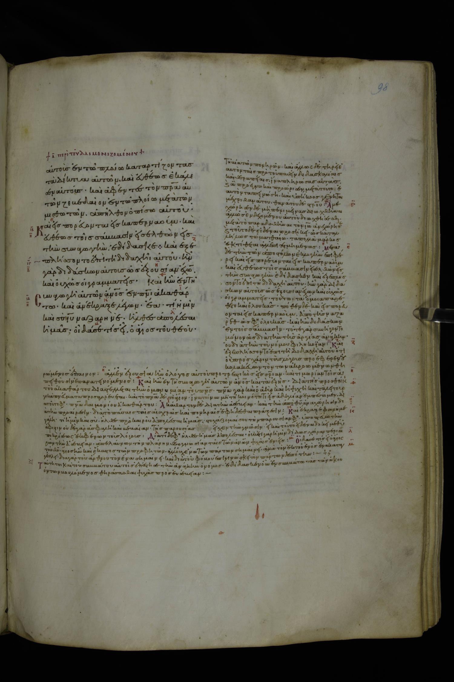 Tenth century minuscule of the Gospels with commentary; 285 leaves, 1 column, 4-34 lines per column. Images were taken at the National Library of Greece in Athens.