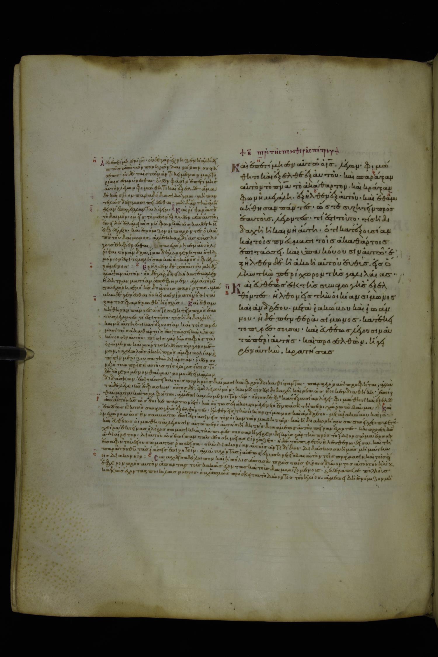 Tenth century minuscule of the Gospels with commentary; 285 leaves, 1 column, 4-34 lines per column. Images were taken at the National Library of Greece in Athens.