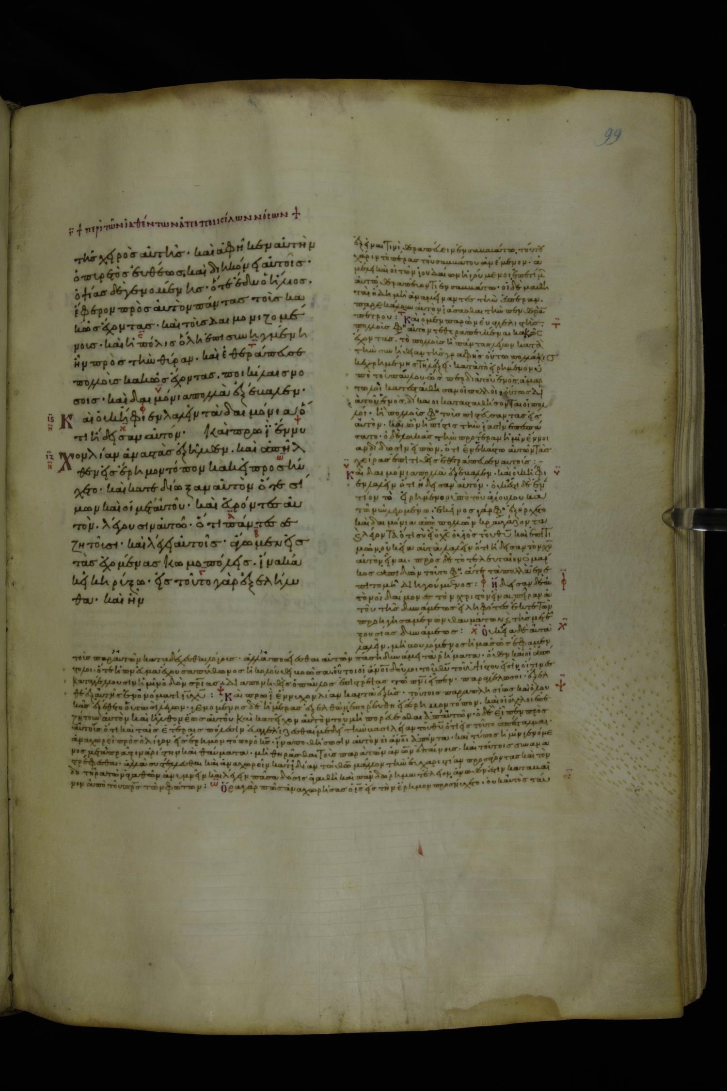 Tenth century minuscule of the Gospels with commentary; 285 leaves, 1 column, 4-34 lines per column. Images were taken at the National Library of Greece in Athens.