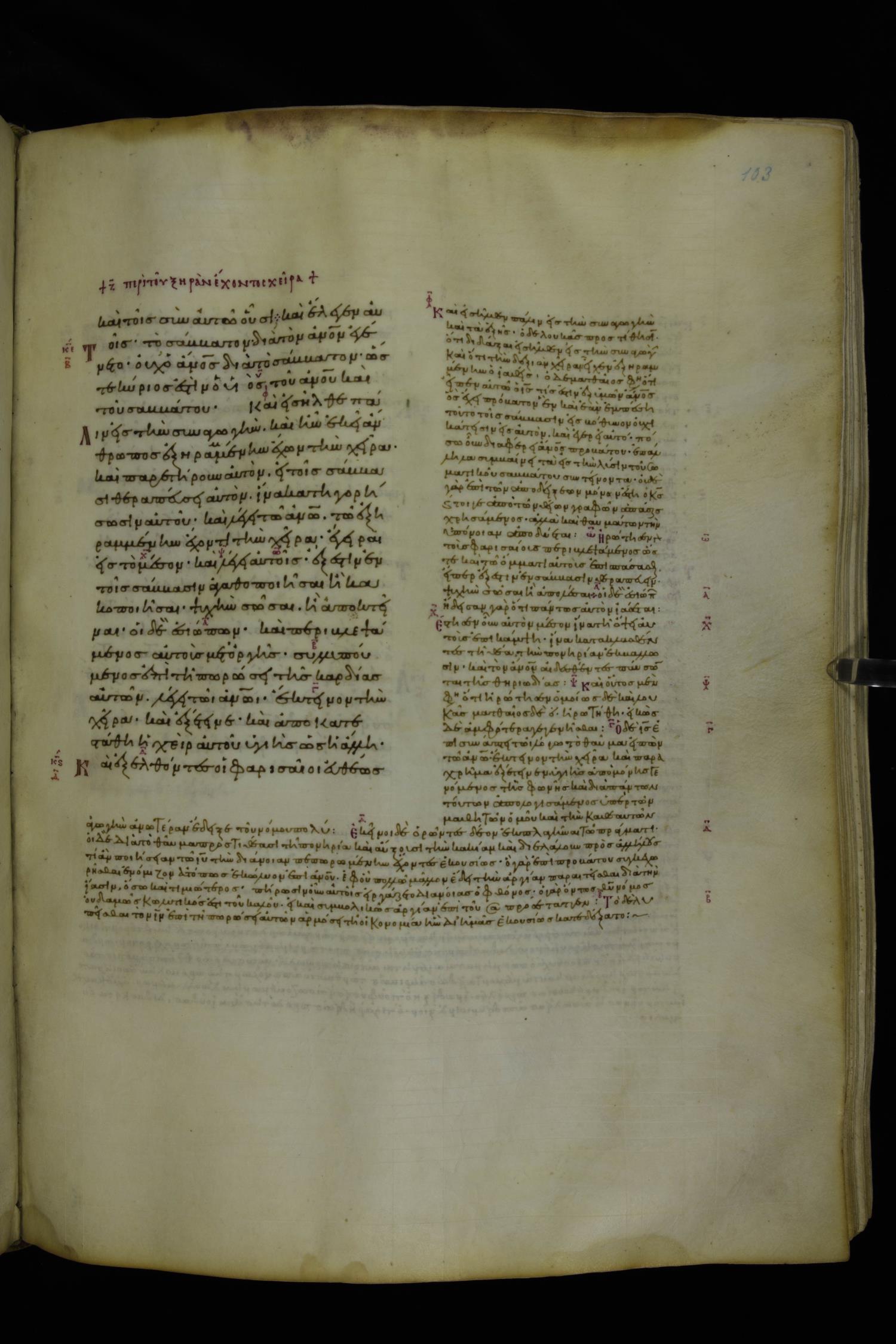 Tenth century minuscule of the Gospels with commentary; 285 leaves, 1 column, 4-34 lines per column. Images were taken at the National Library of Greece in Athens.