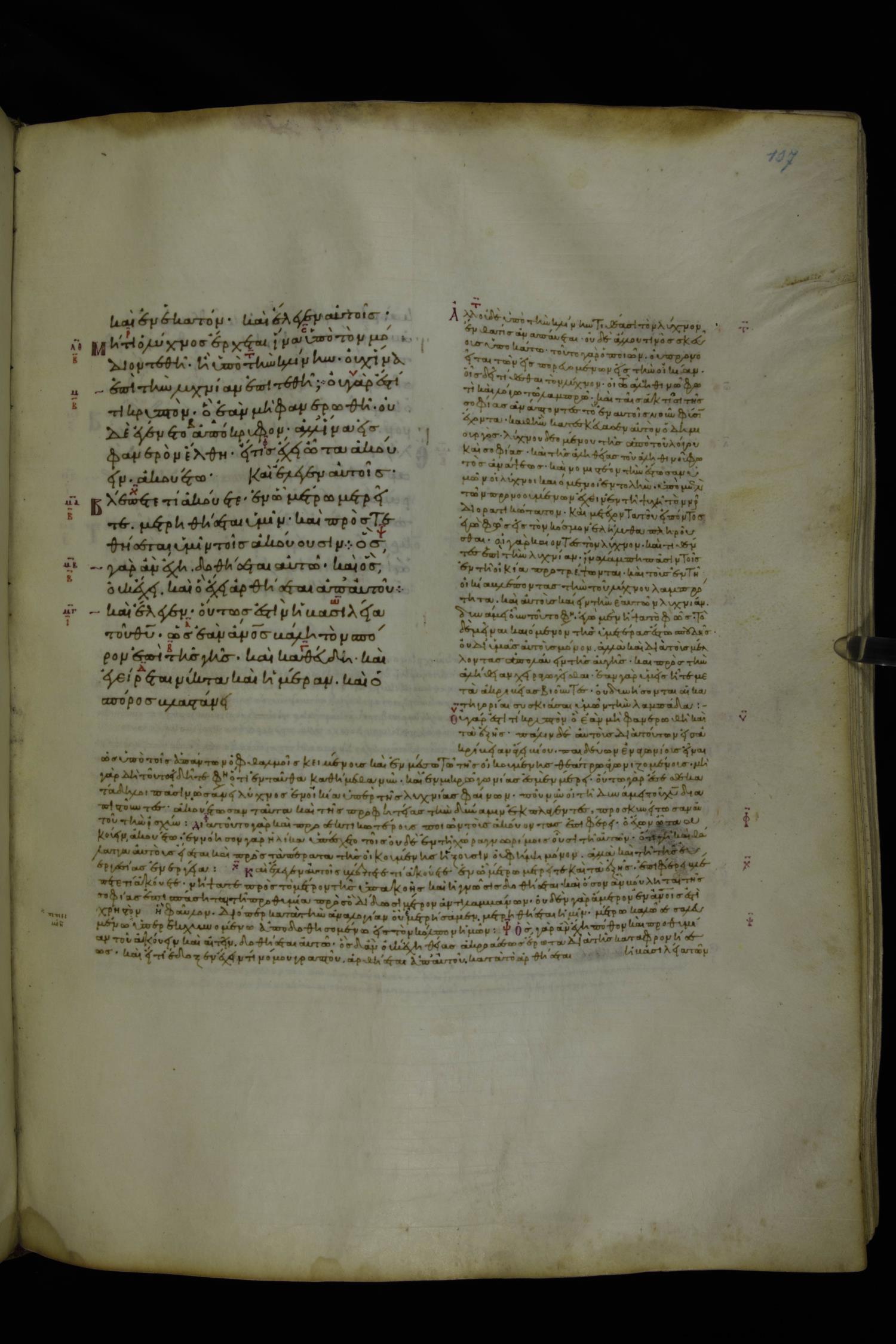 Tenth century minuscule of the Gospels with commentary; 285 leaves, 1 column, 4-34 lines per column. Images were taken at the National Library of Greece in Athens.