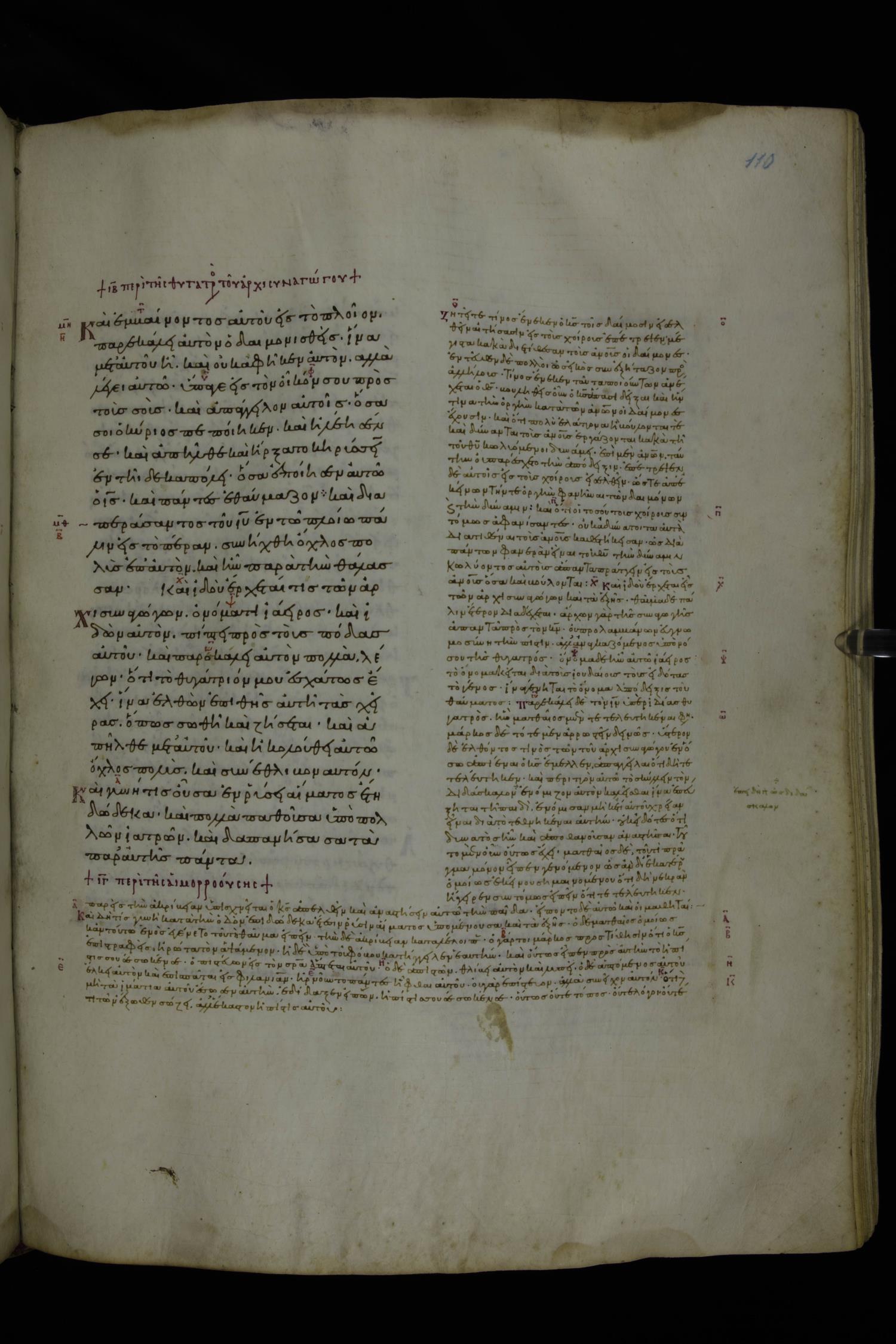 Tenth century minuscule of the Gospels with commentary; 285 leaves, 1 column, 4-34 lines per column. Images were taken at the National Library of Greece in Athens.