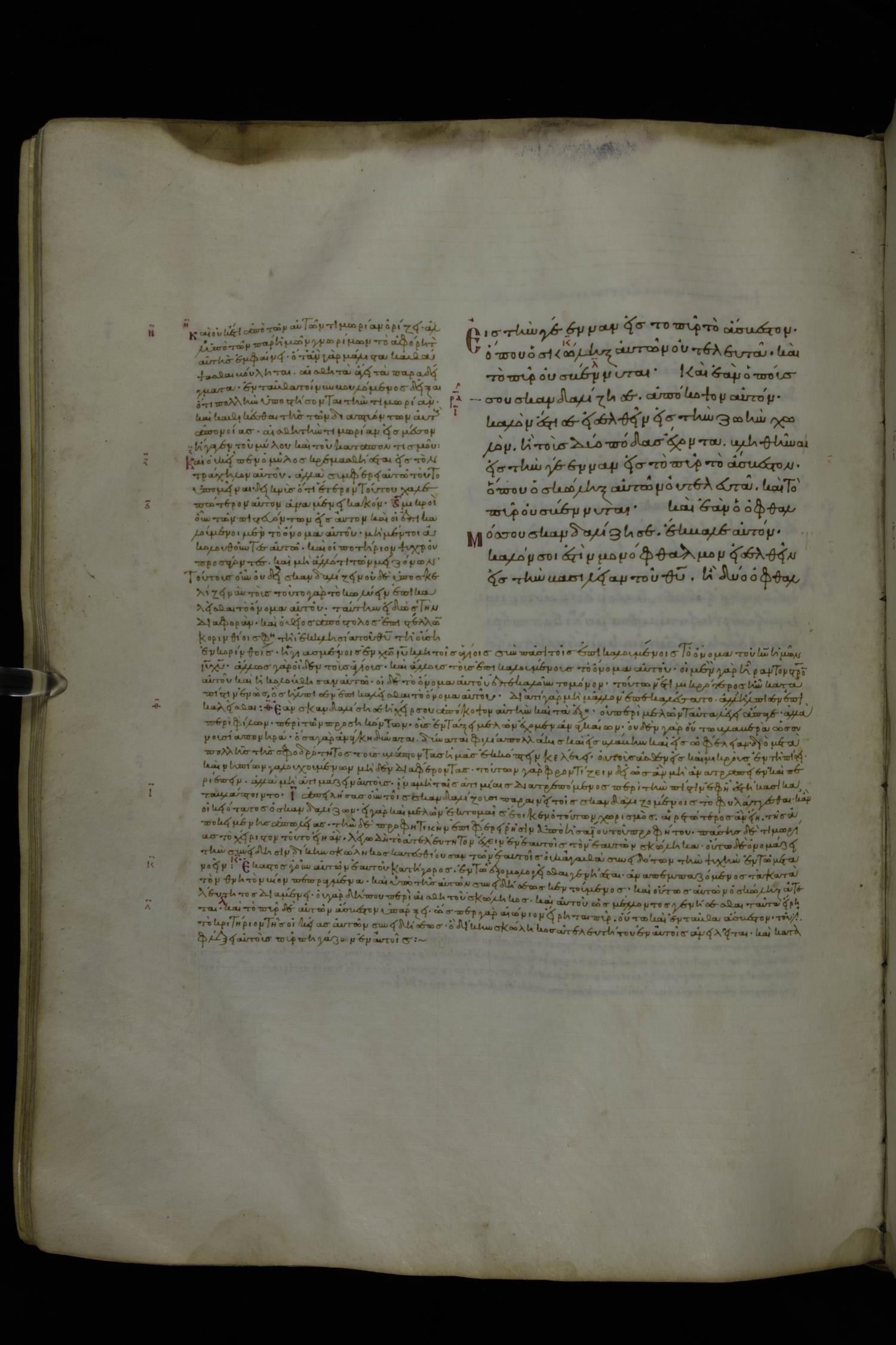 Tenth century minuscule of the Gospels with commentary; 285 leaves, 1 column, 4-34 lines per column. Images were taken at the National Library of Greece in Athens.