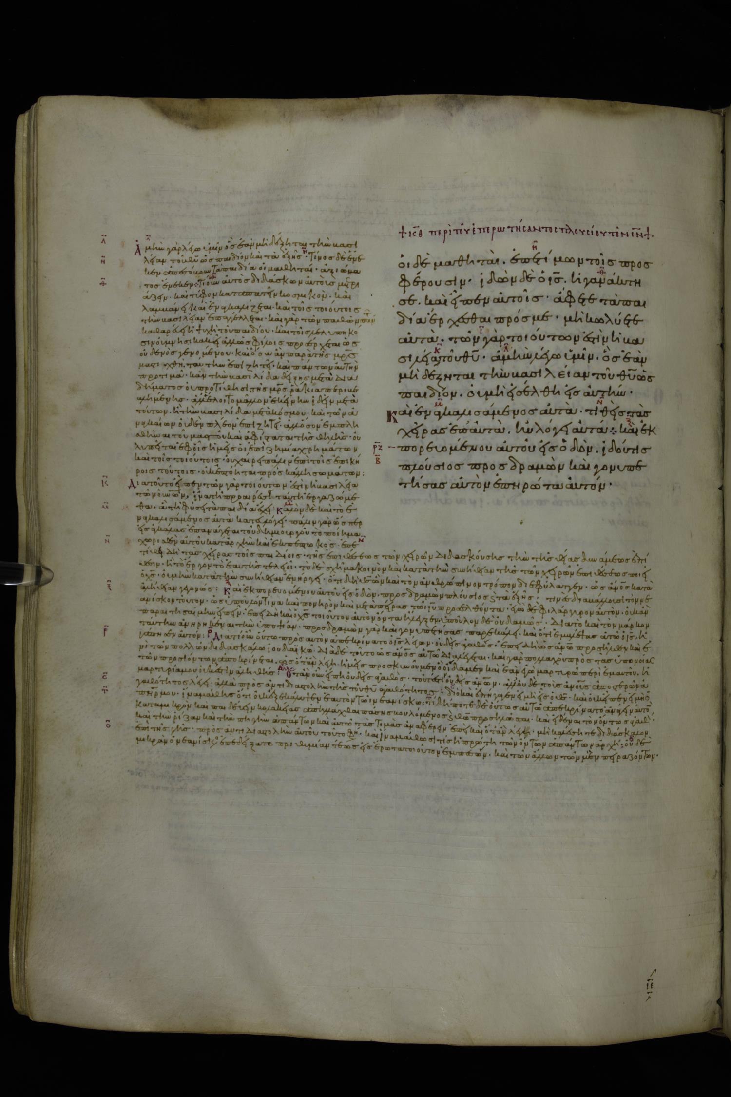 Tenth century minuscule of the Gospels with commentary; 285 leaves, 1 column, 4-34 lines per column. Images were taken at the National Library of Greece in Athens.