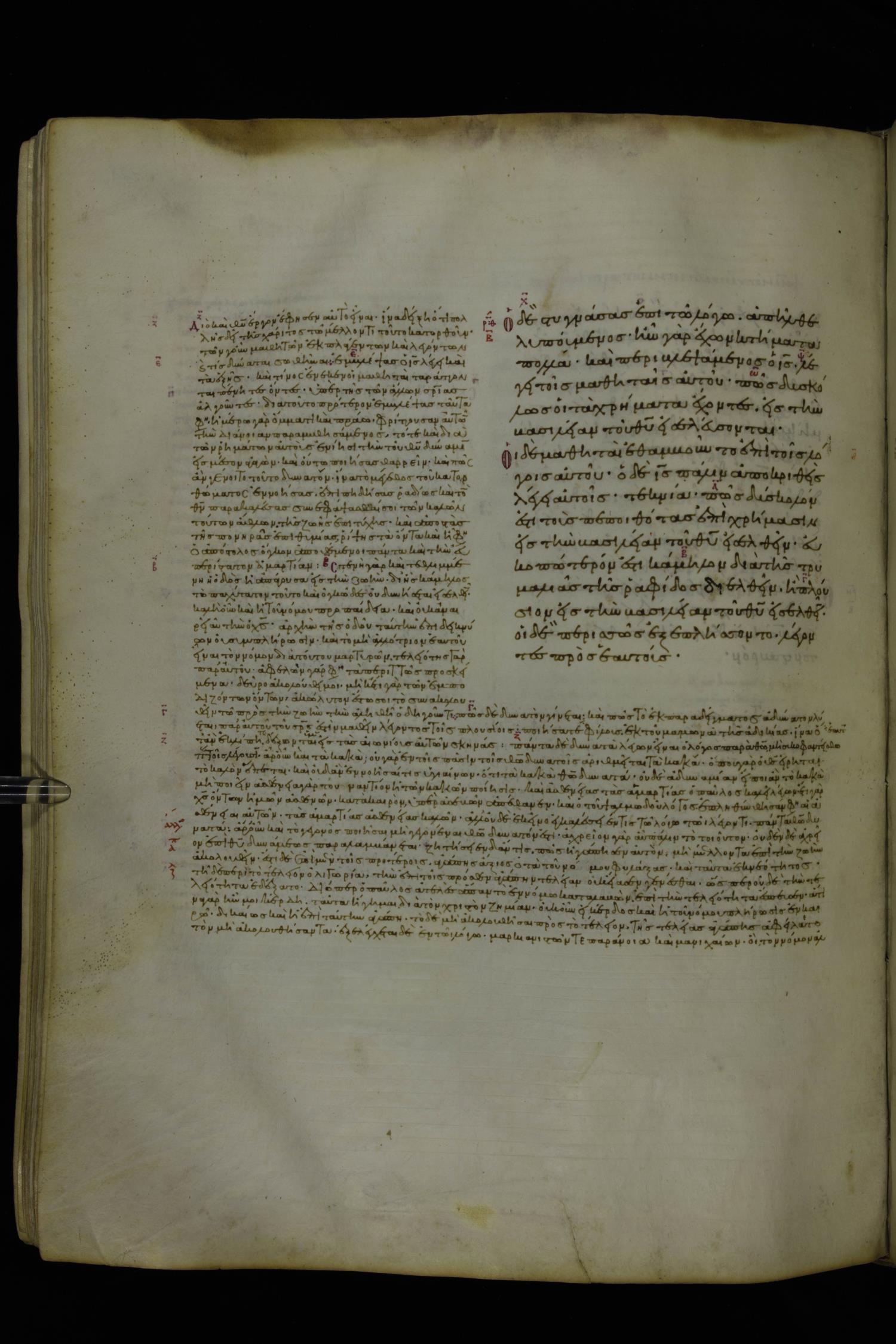Tenth century minuscule of the Gospels with commentary; 285 leaves, 1 column, 4-34 lines per column. Images were taken at the National Library of Greece in Athens.
