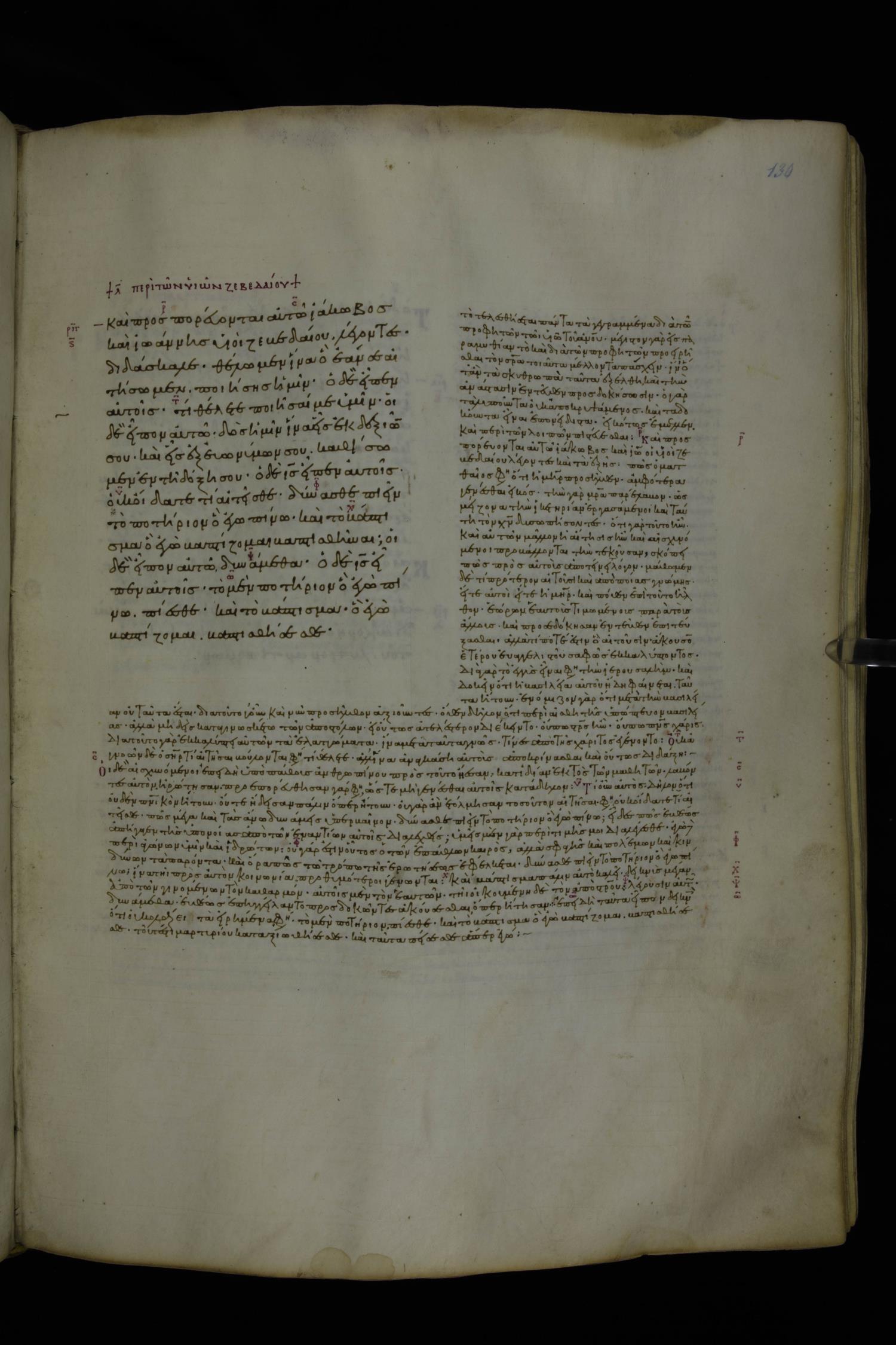 Tenth century minuscule of the Gospels with commentary; 285 leaves, 1 column, 4-34 lines per column. Images were taken at the National Library of Greece in Athens.