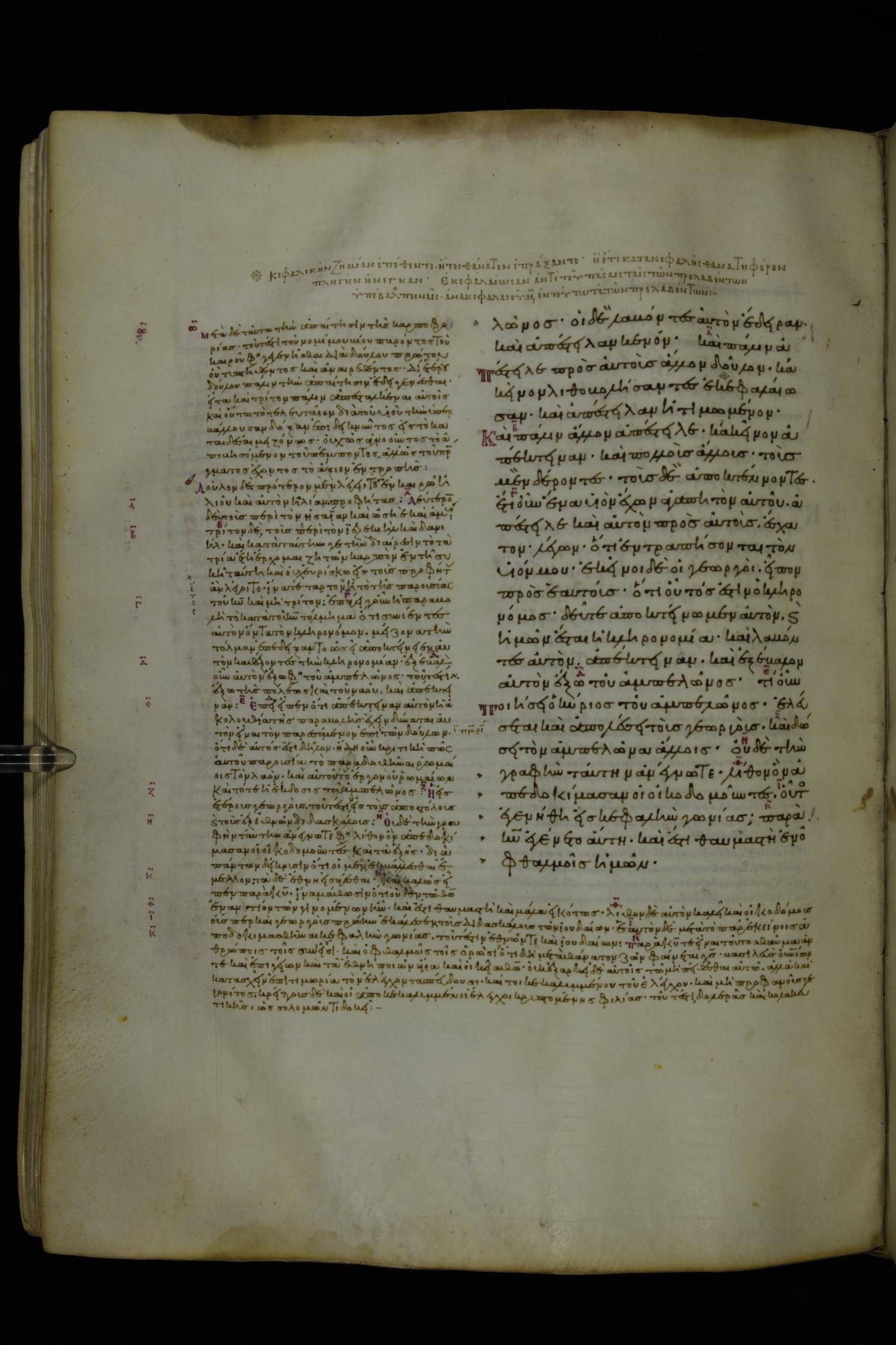 Tenth century minuscule of the Gospels with commentary; 285 leaves, 1 column, 4-34 lines per column. Images were taken at the National Library of Greece in Athens.