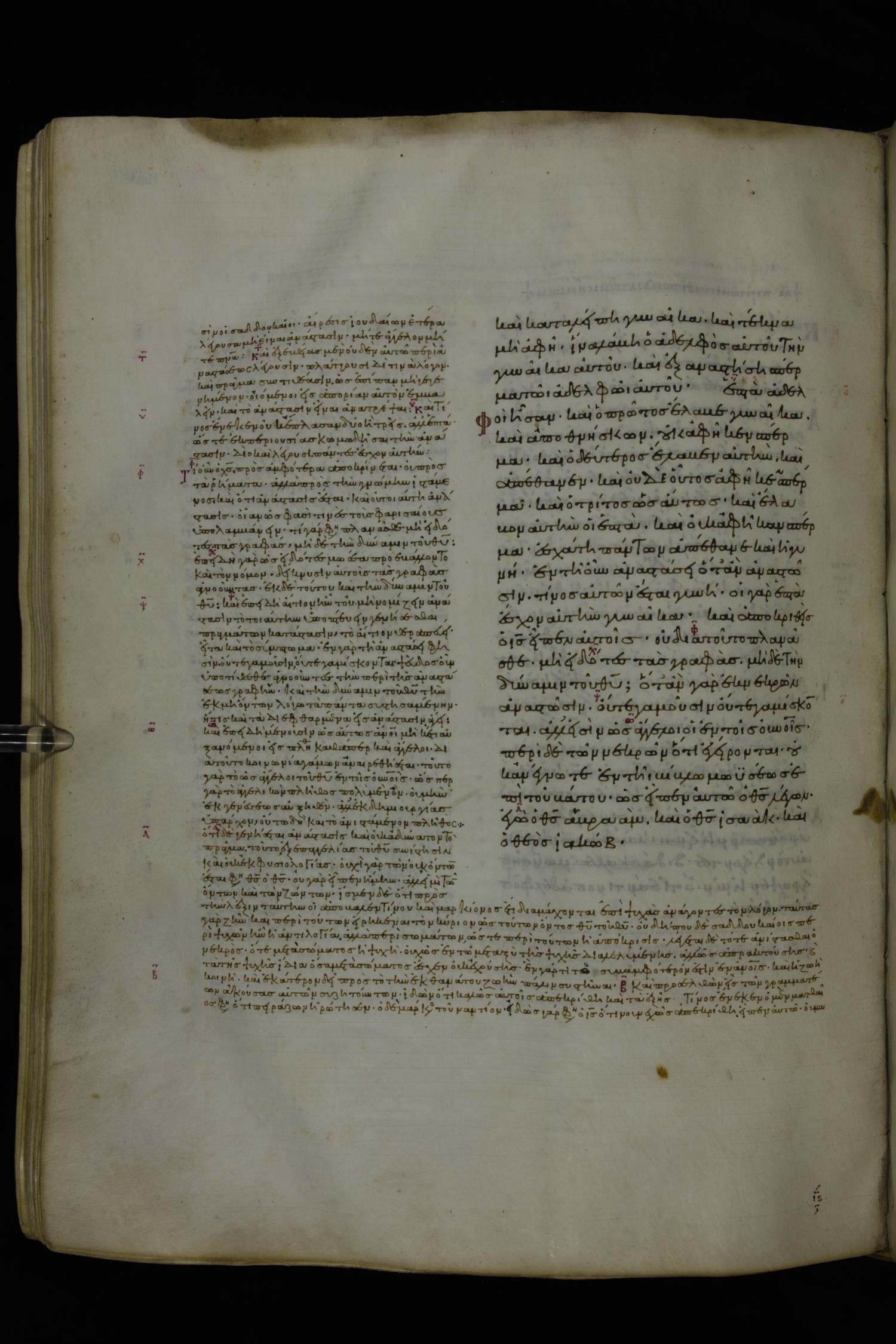 Tenth century minuscule of the Gospels with commentary; 285 leaves, 1 column, 4-34 lines per column. Images were taken at the National Library of Greece in Athens.