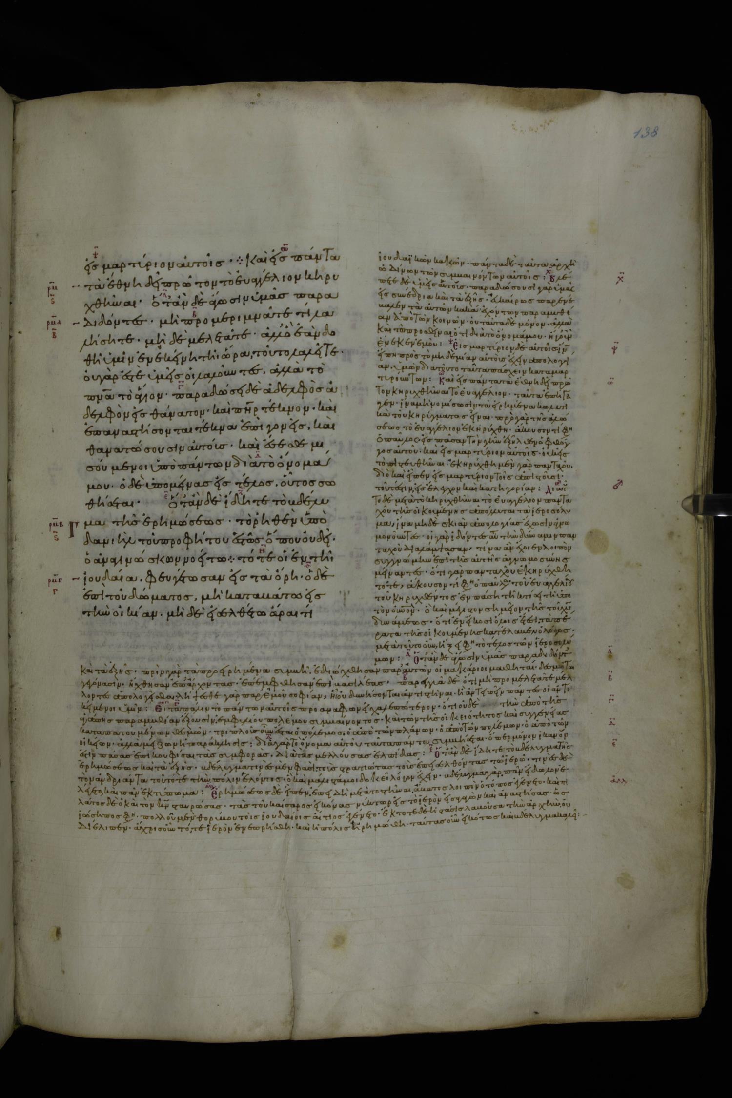 Tenth century minuscule of the Gospels with commentary; 285 leaves, 1 column, 4-34 lines per column. Images were taken at the National Library of Greece in Athens.