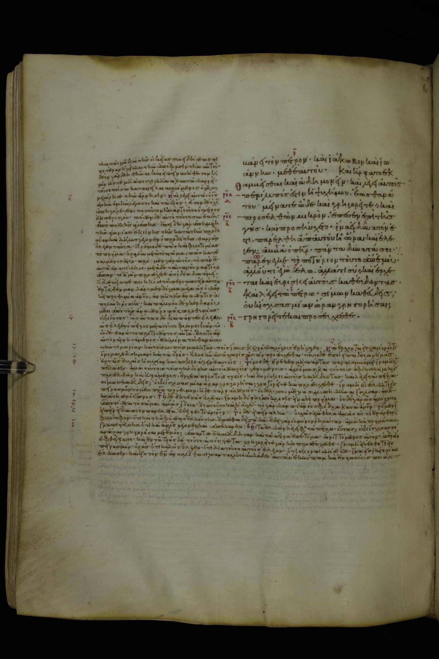 Tenth century minuscule of the Gospels with commentary; 285 leaves, 1 column, 4-34 lines per column. Images were taken at the National Library of Greece in Athens.