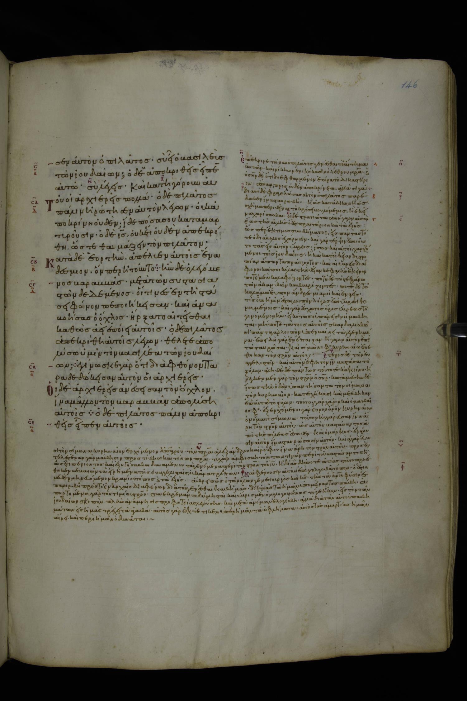 Tenth century minuscule of the Gospels with commentary; 285 leaves, 1 column, 4-34 lines per column. Images were taken at the National Library of Greece in Athens.