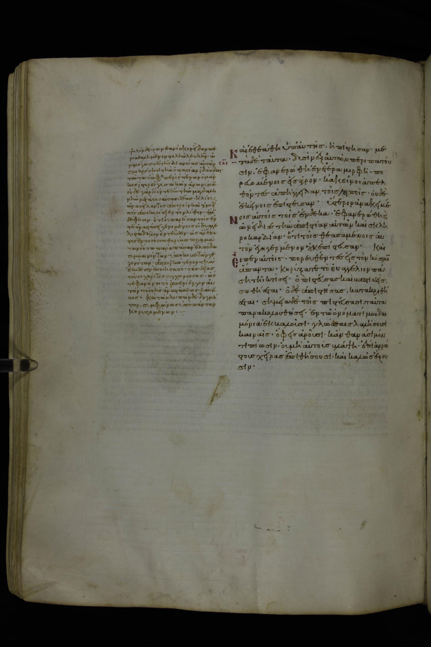 Tenth century minuscule of the Gospels with commentary; 285 leaves, 1 column, 4-34 lines per column. Images were taken at the National Library of Greece in Athens.