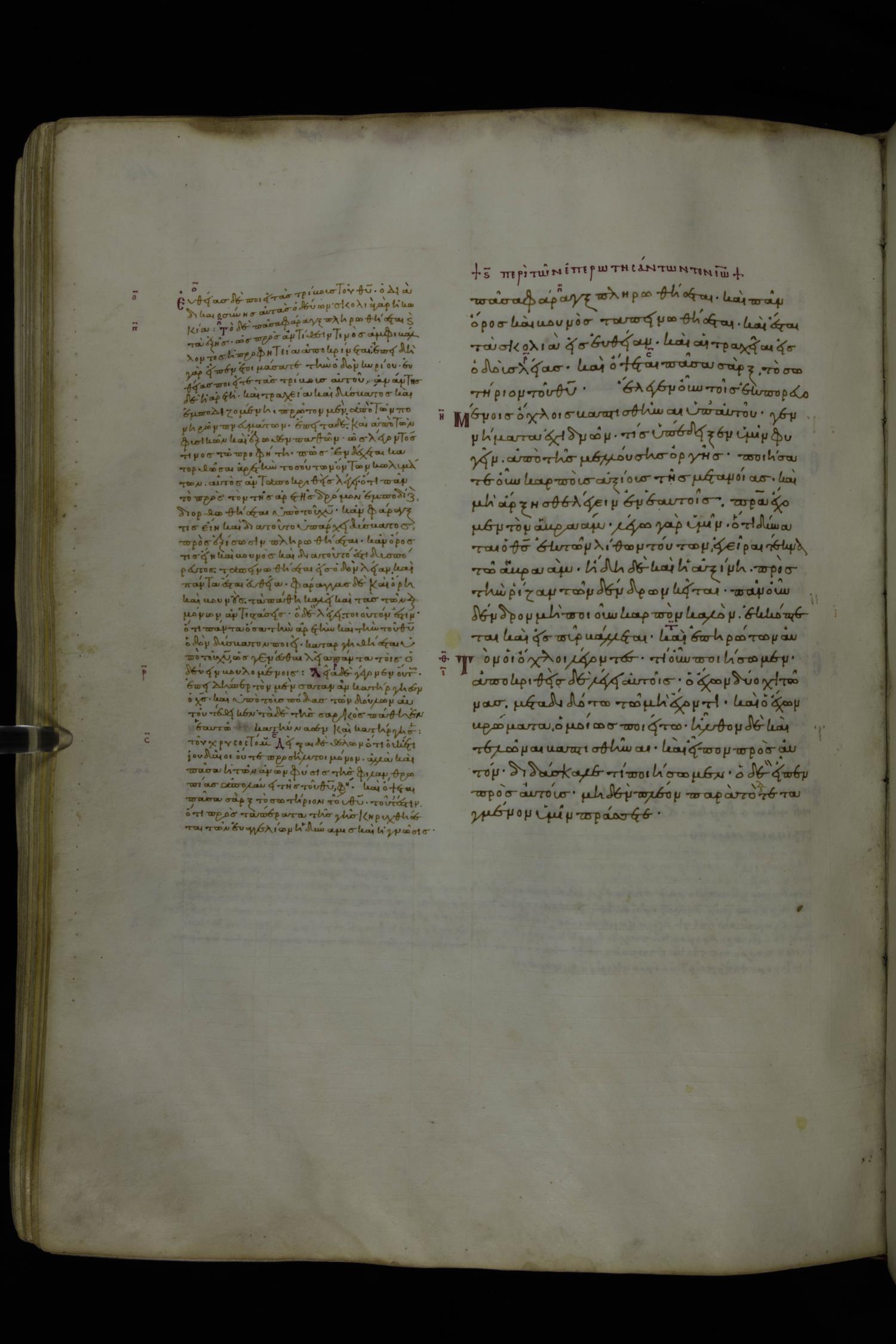 Tenth century minuscule of the Gospels with commentary; 285 leaves, 1 column, 4-34 lines per column. Images were taken at the National Library of Greece in Athens.