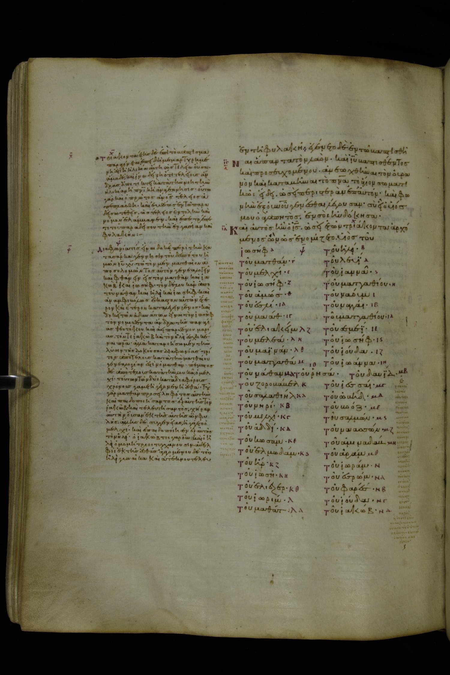 Tenth century minuscule of the Gospels with commentary; 285 leaves, 1 column, 4-34 lines per column. Images were taken at the National Library of Greece in Athens.