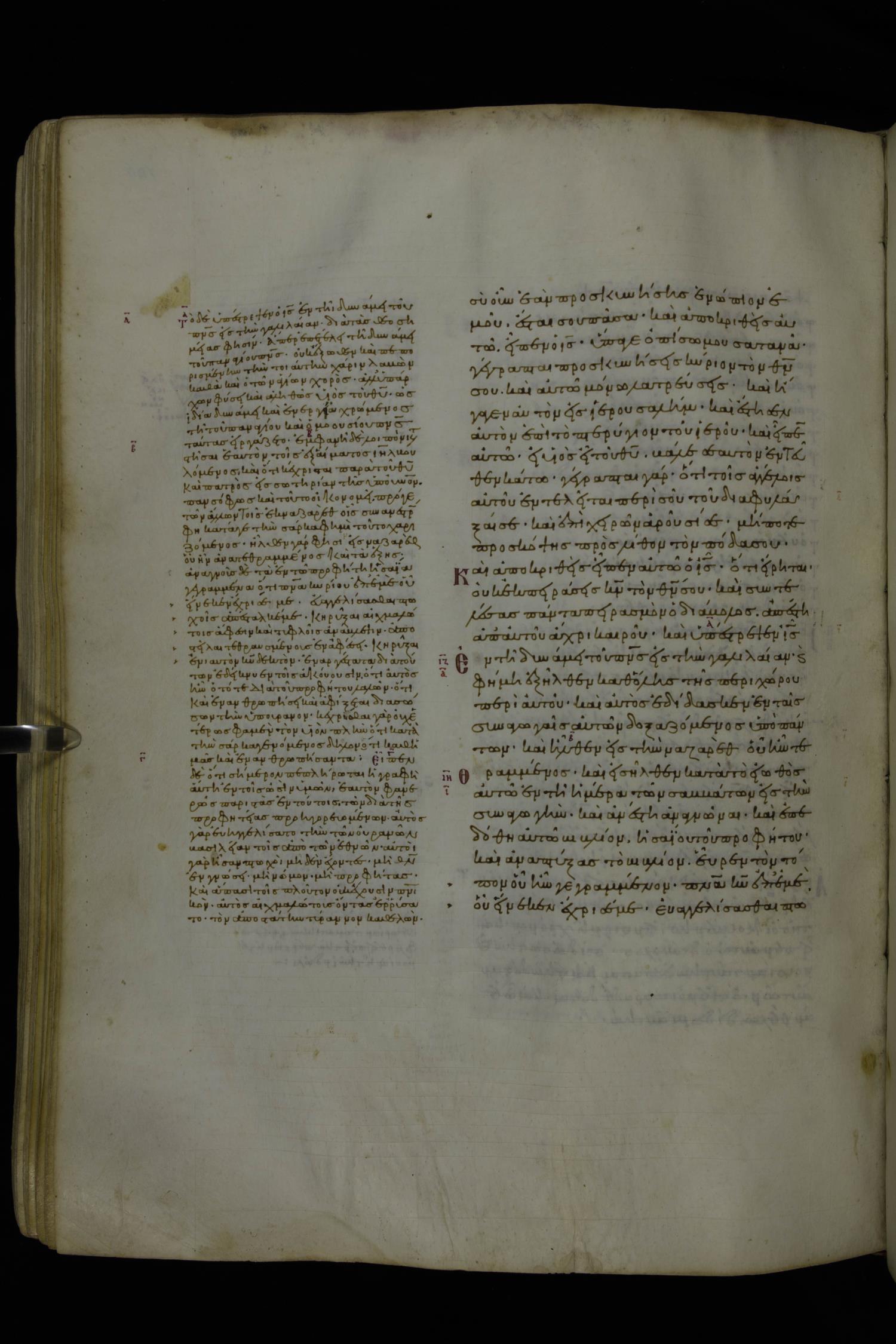 Tenth century minuscule of the Gospels with commentary; 285 leaves, 1 column, 4-34 lines per column. Images were taken at the National Library of Greece in Athens.