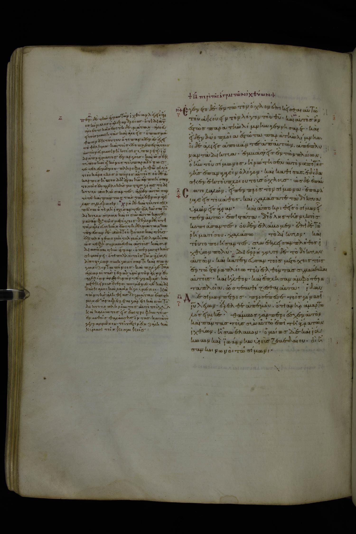 Tenth century minuscule of the Gospels with commentary; 285 leaves, 1 column, 4-34 lines per column. Images were taken at the National Library of Greece in Athens.