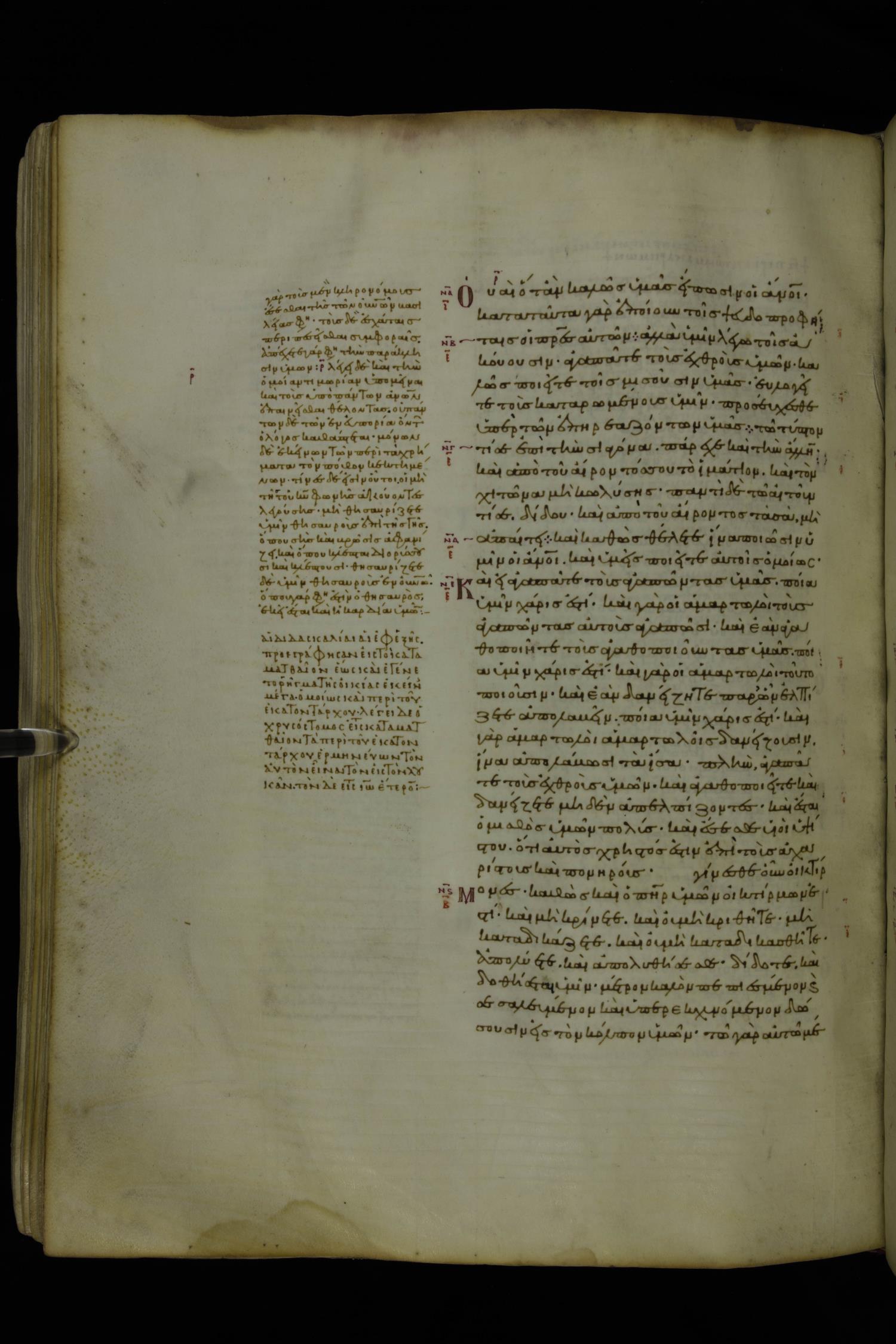 Tenth century minuscule of the Gospels with commentary; 285 leaves, 1 column, 4-34 lines per column. Images were taken at the National Library of Greece in Athens.