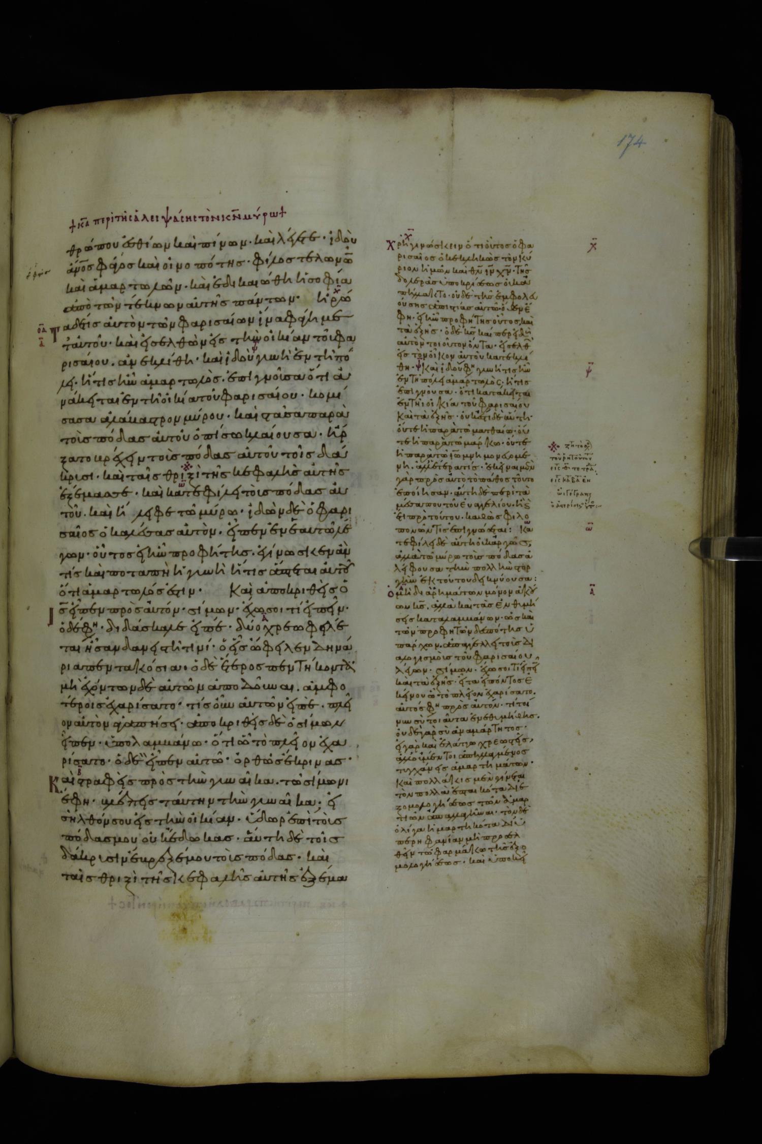 Tenth century minuscule of the Gospels with commentary; 285 leaves, 1 column, 4-34 lines per column. Images were taken at the National Library of Greece in Athens.