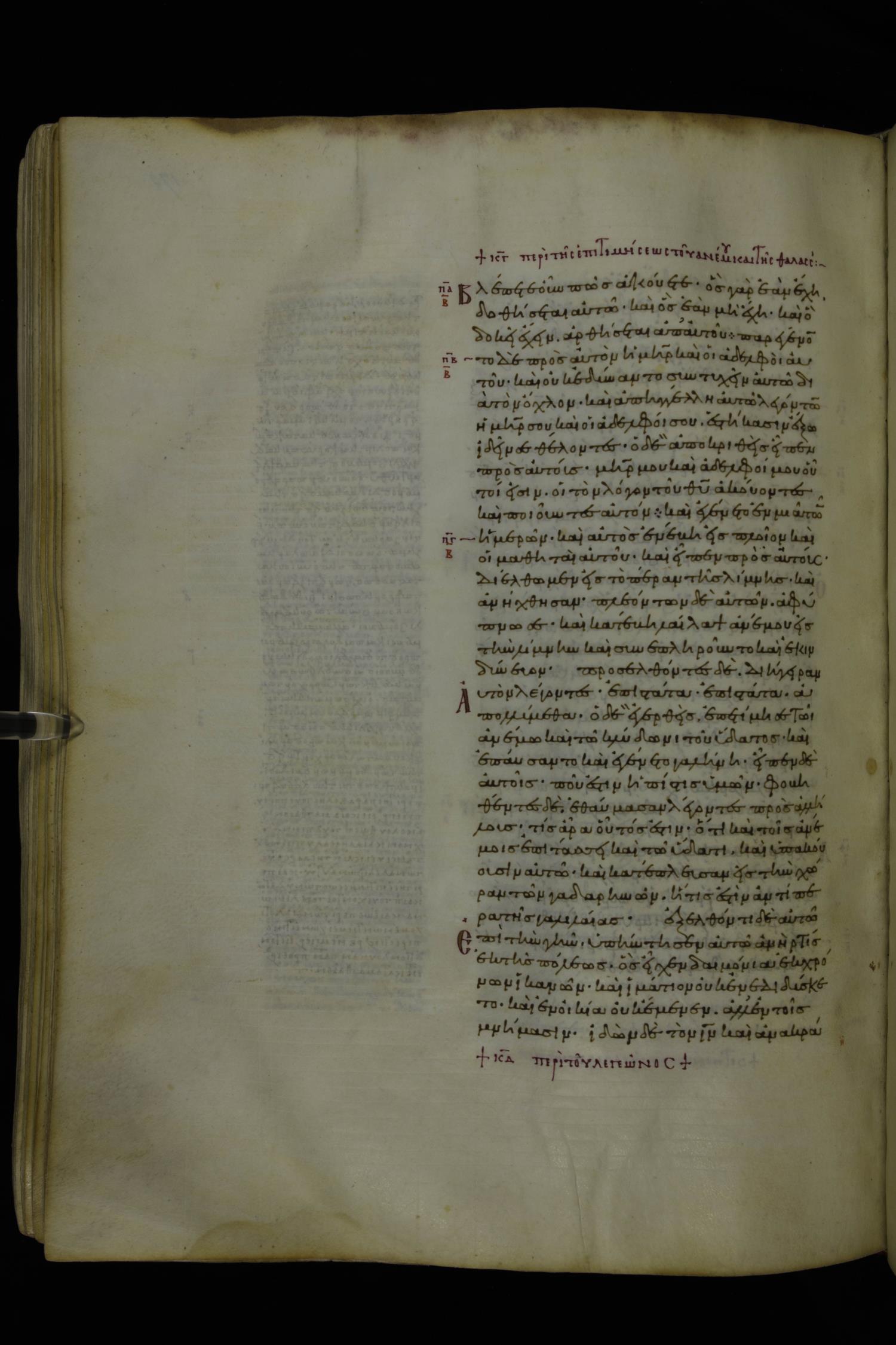 Tenth century minuscule of the Gospels with commentary; 285 leaves, 1 column, 4-34 lines per column. Images were taken at the National Library of Greece in Athens.