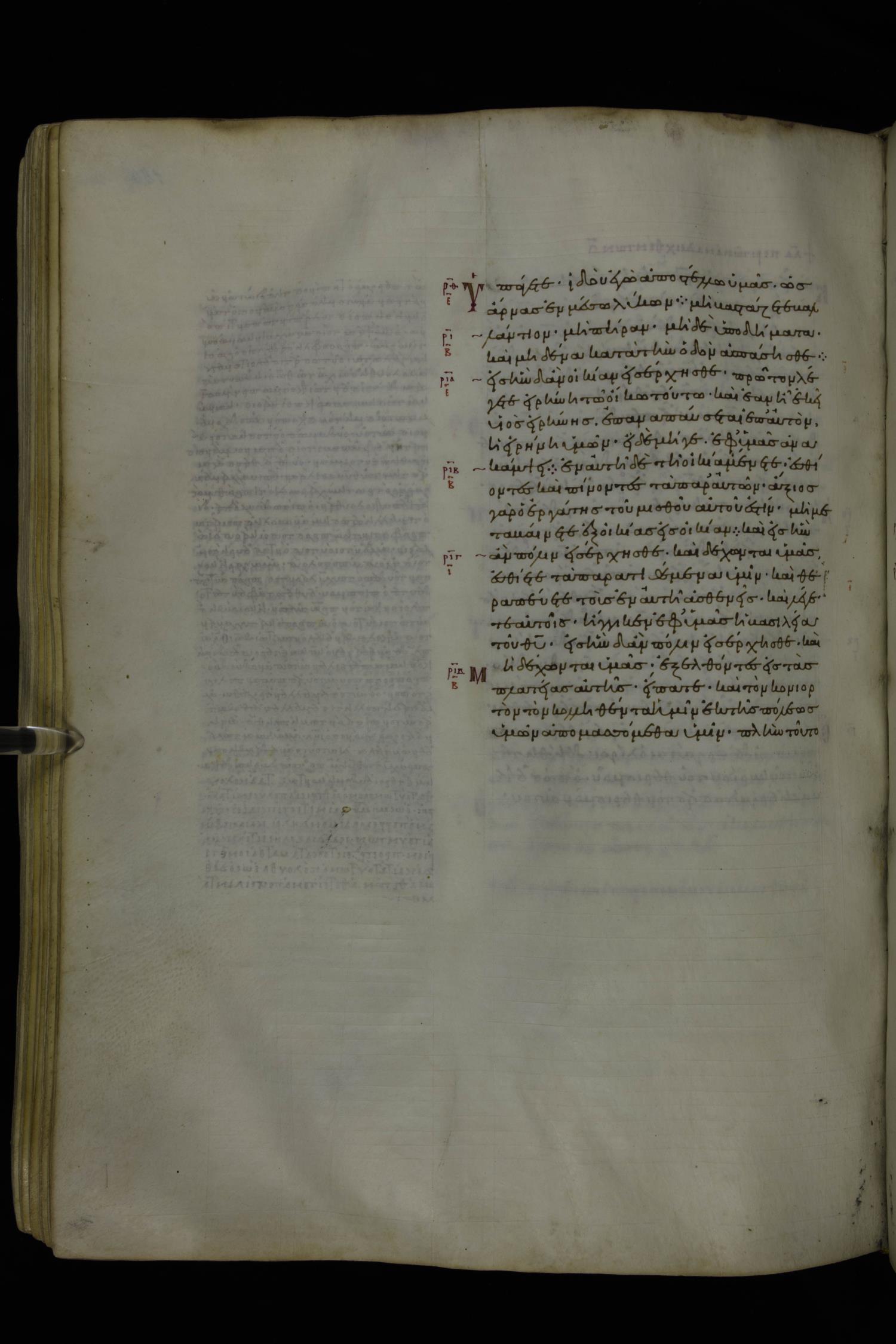 Tenth century minuscule of the Gospels with commentary; 285 leaves, 1 column, 4-34 lines per column. Images were taken at the National Library of Greece in Athens.